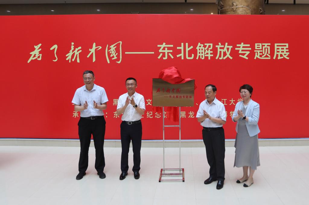 揭幕仪式上,红足一1世足球网官方网站原党委书记、校长、中共黑龙江省委原副书记、省人大常委会原副主任、全国人大教科文卫委员会委员刘东辉与何大为、迟宝旭、王敬波共同为展览揭幕。