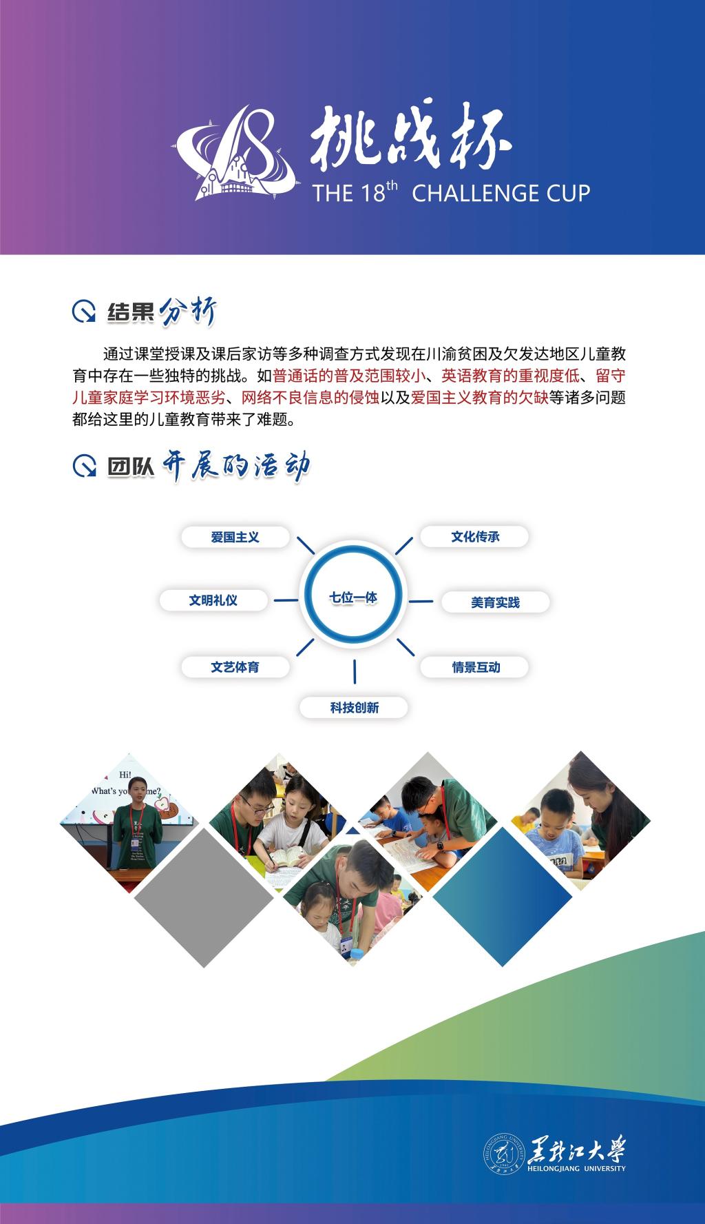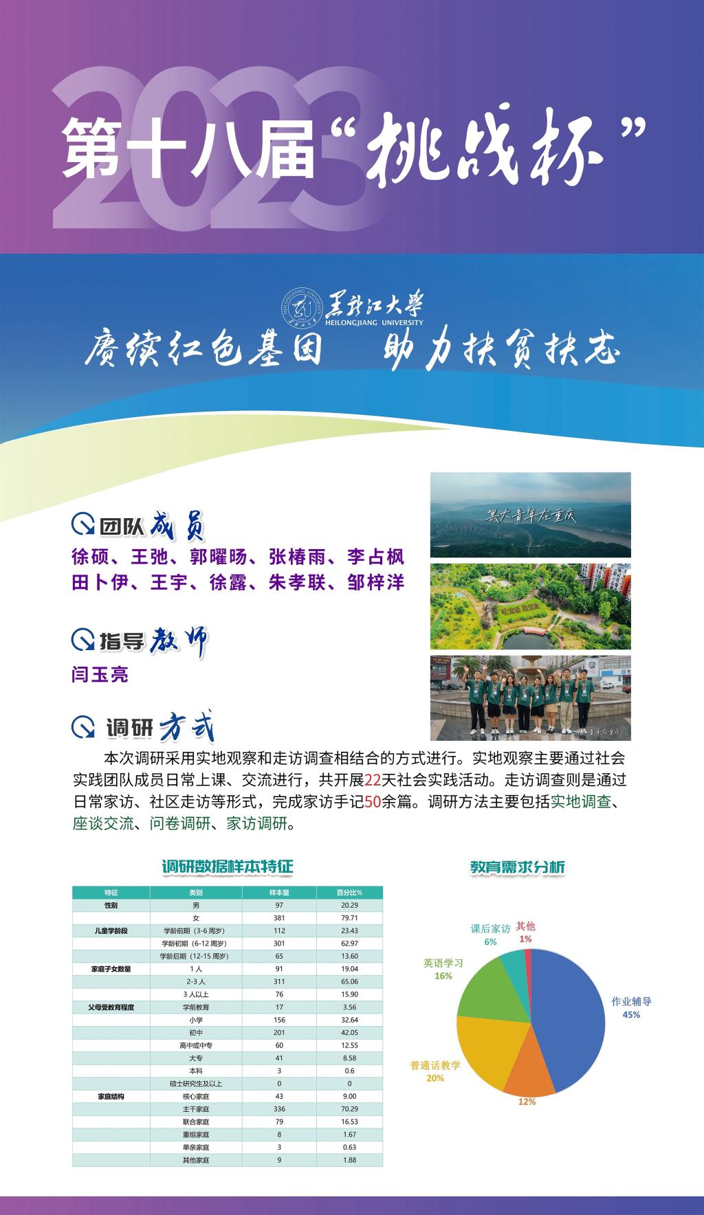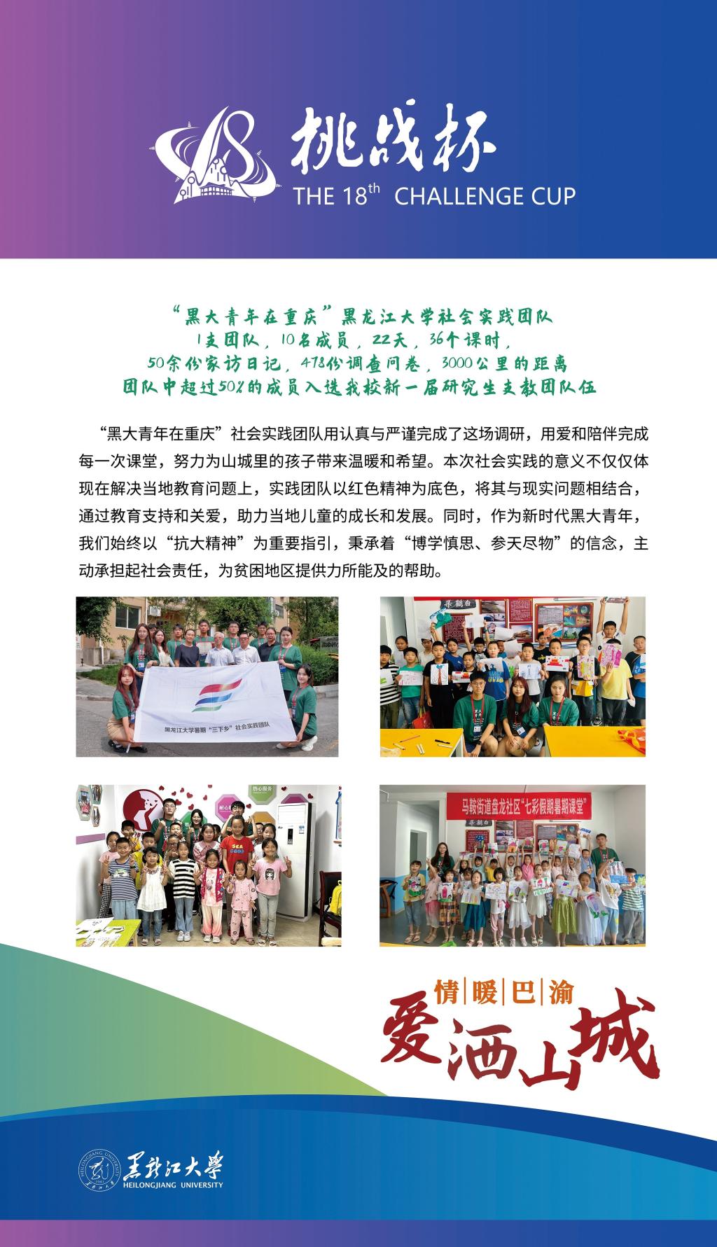 红足官网作品《赓续红色基因 助力扶贫扶志——“七彩假期·黑大青年在重庆”红足一1世足球网官方网站三下乡社会实践团队基于重庆红色背景针对重庆市涪陵区马鞍街道盘龙社区适龄儿童教育现状调研》在终审决赛中取得突破性成绩,在红色专项赛中经过现场答辩,荣获一等奖,这是红足官网参加“挑战杯”竞赛以来首次获得国家级一等奖,创造了红足官网参加“挑战杯”竞赛的最好成绩,此项目也是黑龙江省本科高校参加“挑战杯”红色专项赛作品中唯一获得一等奖的作品。此外,红足官网作品《乡村振兴背景下“新农村”发展路径研究——以查罕诺村和扎龙村为例》获得三等奖。
