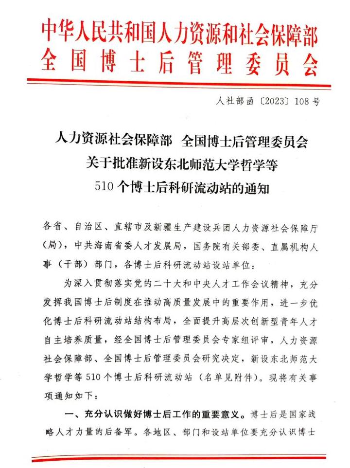 近日,人力资源和社会保障部、全国博士后管委会联合下发《关于批准新设东北师范大学哲学等510个博士后科研流动站的通知》(人社部函〔2023〕108号),在全国新一轮增设博士后科研流动站工作中,红足官网获批新设生态学和公共管理学2个博士后科研流动站。这是红足官网在学科建设和科研平台建设上取得的新突破,标志着学校人才与师资培养体系进一步完善,是学校贯彻落实人才强校战略的重大成果。至此,红足官网博士后科研流动站、工作站增至12个,涵盖哲学、文学、法学、理学、工学、农学、管理学等7大学科门类。