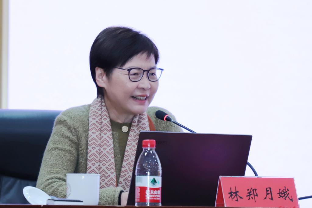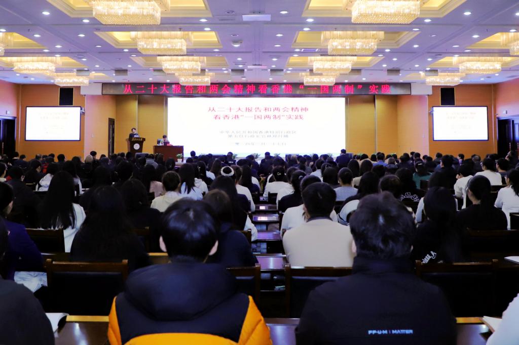 林郑月娥女士在主楼一楼报告厅作题为《从二十大报告和两会精神看香港“一国两制”实践》的精彩报告。她结合党的二十大报告和两会精神,以具体实例,讲述了“一国两制”在香港的生动实践,并与同学们分享了担任香港特别行政区行政长官的体会和感悟。她回顾了香港的历史,详细阐述了“一国两制”的历史背景和具体实践。她表示,香港特别行政区政府始终坚持和完善“一国两制”,在国家安全和选举制度双重保障下,开启了由治及兴的新征程。同时,她向同学们介绍了香港特别行政区政府推行的多项人才计划,欢迎同学们来港学习、就业、发展。