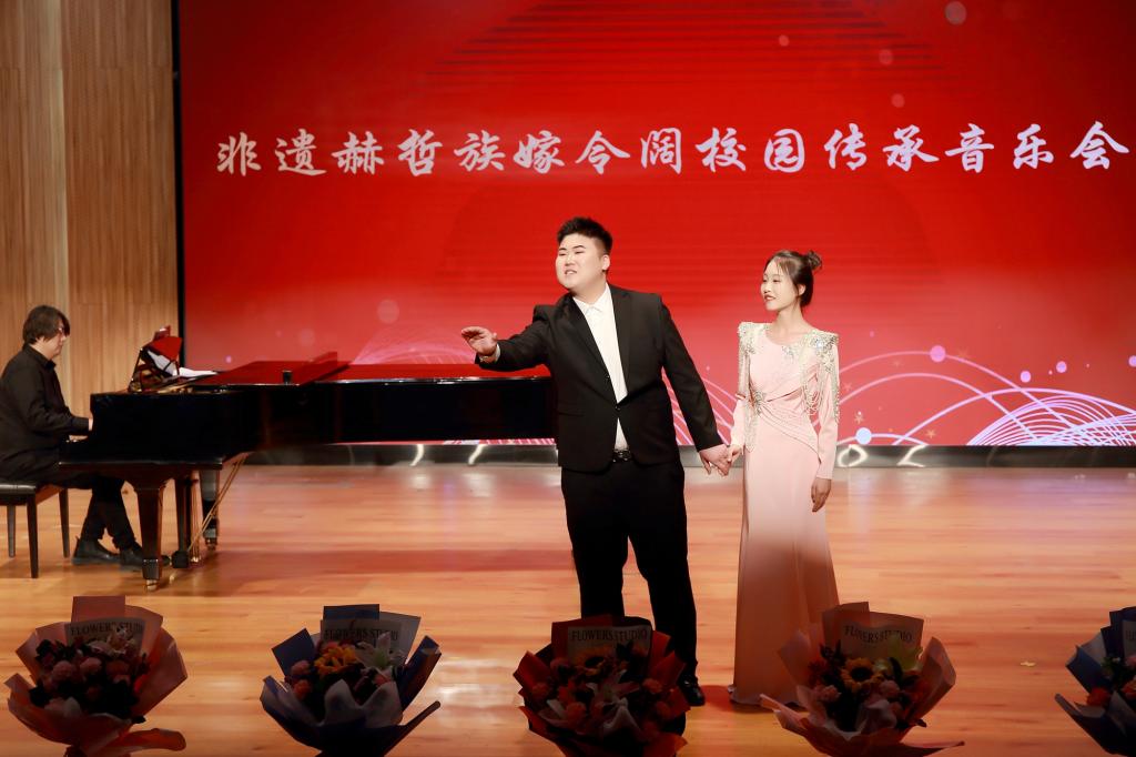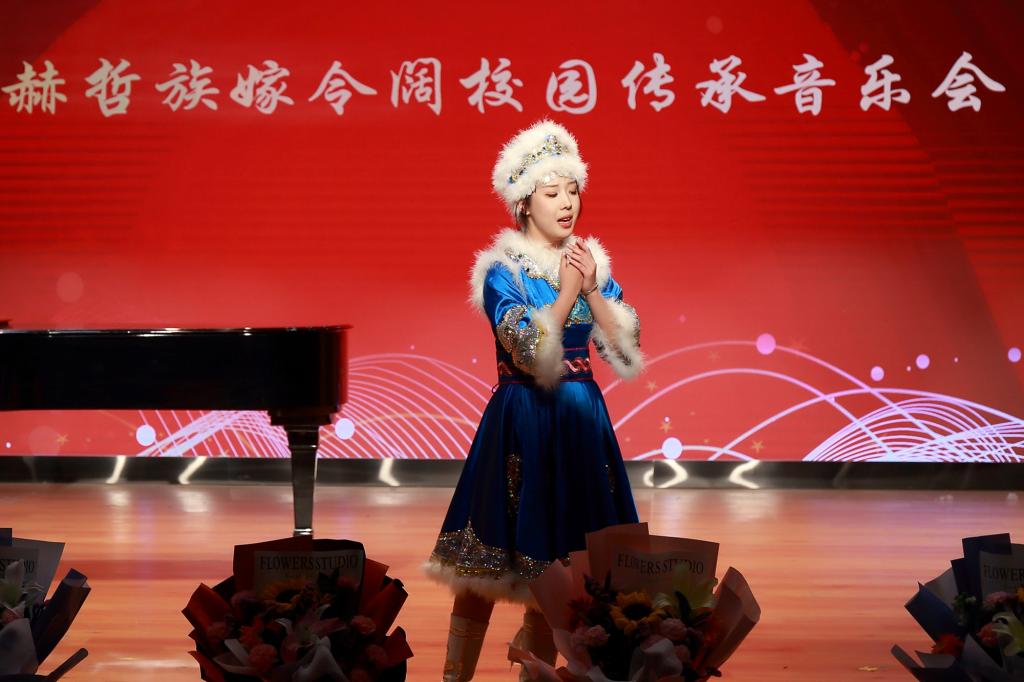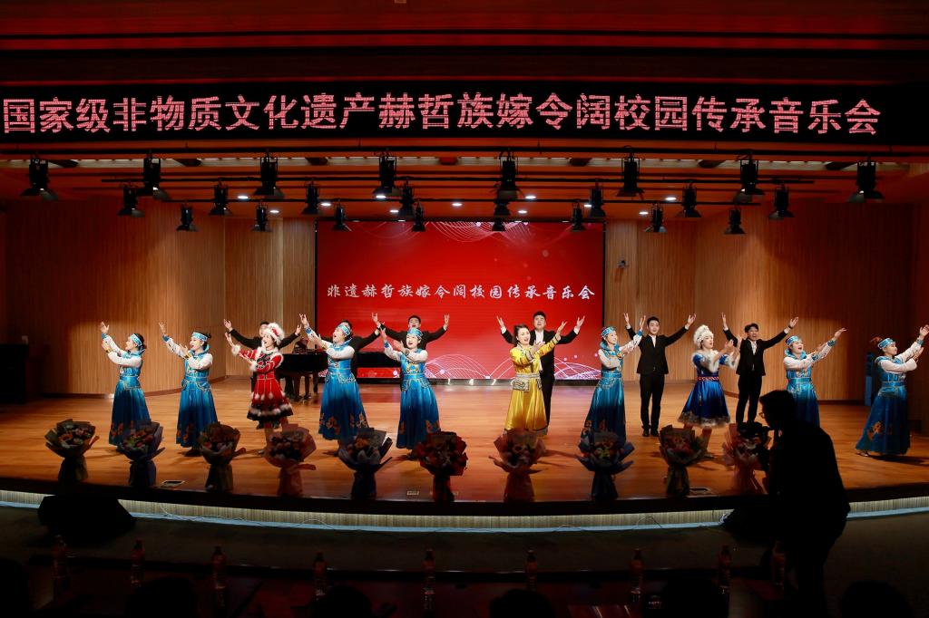 由赫哲族嫁令阔传承创新团队全体成员带来的《盛世赫哲》拉开了校园传承音乐会的序幕,悠扬的赫哲族小调勾勒出一副副幽静甜美的画面,富有寓意的歌词把赫哲族人民奔向美好明天的革命激情和坚定信念表达的淋漓尽致。《赫哲人》展现了冉冉朝阳,声声杜鹃的赫哲风光,智慧和勤劳的赫哲人民迎来了繁荣和兴旺。歌曲《献给你,赫哲人的乌日贡》婉转清丽,悠扬嘹亮的歌声伴随着优美舒展的钢琴音展现了赫哲族深厚的传统文化底蕴,凝聚和闪耀着民族智慧结晶。男女对唱《赫乡恋歌》体现了赫哲族传统民歌清新悦耳、耳目一新的特点,如一缕春风扑面而来,潺潺溪水闻声而至。《我是乌苏一滴水》用歌曲的形式表达了对党的无限热爱,歌颂了家乡的发展变化,赞美了乌苏市的好山好水好风光。独唱曲目《口弦叮咚》雕刻巍峨,刻画秀丽,唇齿间仿佛流出溪水冲击岩石的叮咚声,穿透了悠久的时光,诉说着人与自然间真挚的情感。四人合唱《钓鱼歌》以轻松愉快的气息鼓动着众人,体现出作为渔猎民族最普通的日常生活和对于捕鱼生活的热爱。独唱《温吉妮》中动人的音乐旋律,充满浓郁的民族特色,为听众带来独特的听觉享受。《走进船歌唱响的地方》演唱者们通过肢体语言和富有情感的歌唱,将故事情节表现得淋漓尽致,也为音乐的演绎增添了更多的层次感。《圣其勒花》,让人沉浸在悠扬流畅的旋律和优美动听的曲调当中,仿佛置身于古老而神秘的赫哲族世界。在女声独唱《复兴梦想》激昂而又充满斗志的歌声中,表达着中华儿女为实现中华民族伟大复兴的中国梦而不断奋斗的决心。以众人合唱的《赫哲人最爱共产党》作为此次音乐会的结束曲目,体现出赫哲人的民族精神和民族文化。