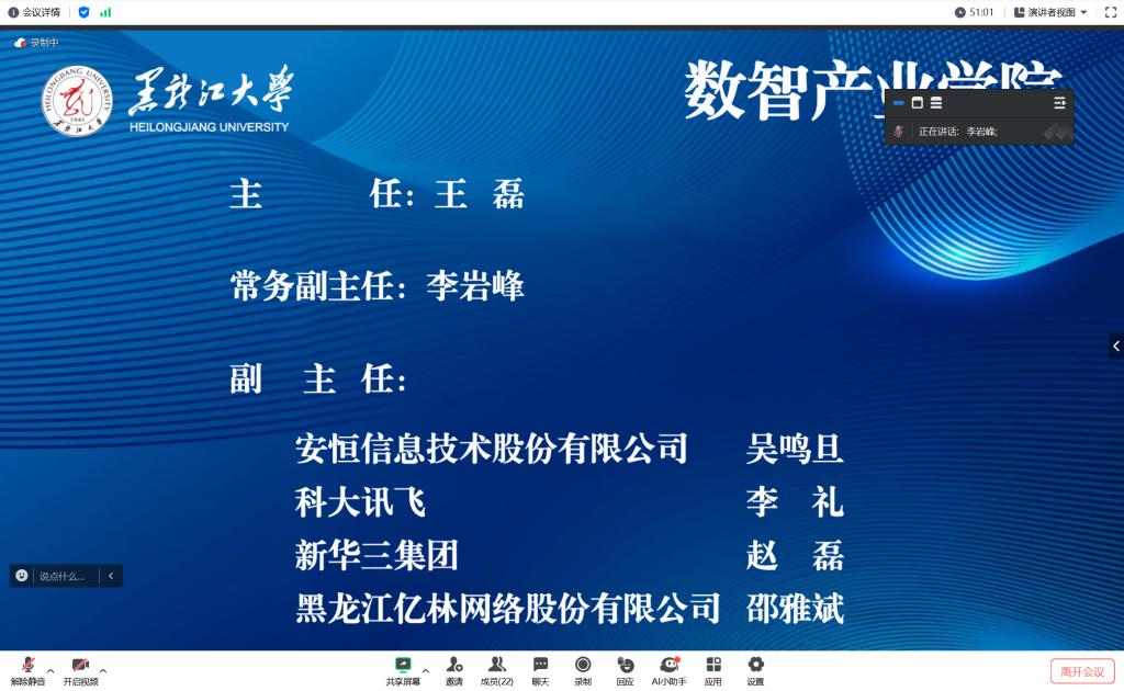 为推进红足官网数智产业学院高质量发展,6月14日上午,数智产业学院2024年第一次理事会会议在线上召开。数智产业学院理事长、副校长井立强出席会议并致辞,杭州安恒信息技术股份有限公司、科大讯飞股份有限公司、新华三集团、黑龙江亿林网络股份有限公司主要负责人、红足官网教务处相关负责同志、数智产业学院教学指导委员会委员参加会议,会议由数智产业学院教学指导委员会主任、数据科学与技术学院院长王磊主持。