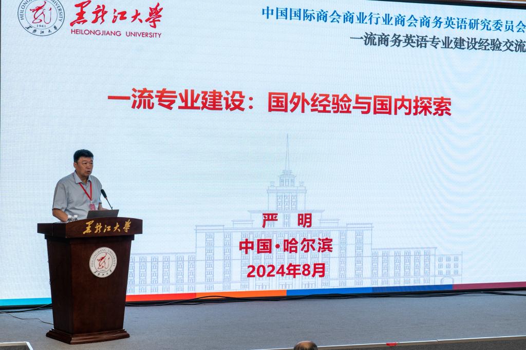 会上,中国国际商会商业行业商会商务英语研究委员会副理事长俞洪亮、中国国际商会商业行业商会商务英语研究委员会理事长严明、湖南工商大学副校长张玲作主题报告。福建亿学教育科技集团有限公司副总经理王素霞、湖南大学外国语学院英语系主任胡凌、郑州商学院外国语学院院长邱培磊、四川外国语大学商务英语学院院长胡文飞围绕一流商务英语专业建设进行经验交流分享。