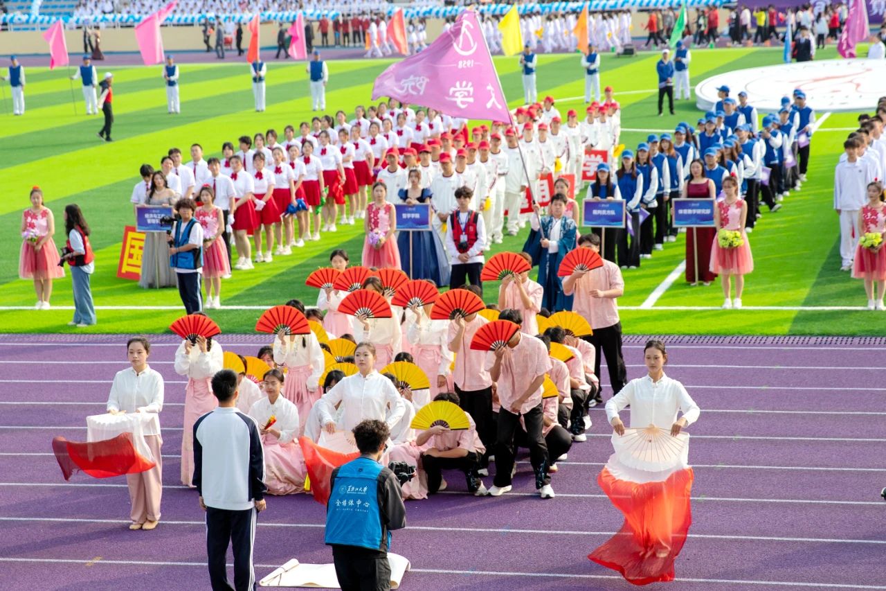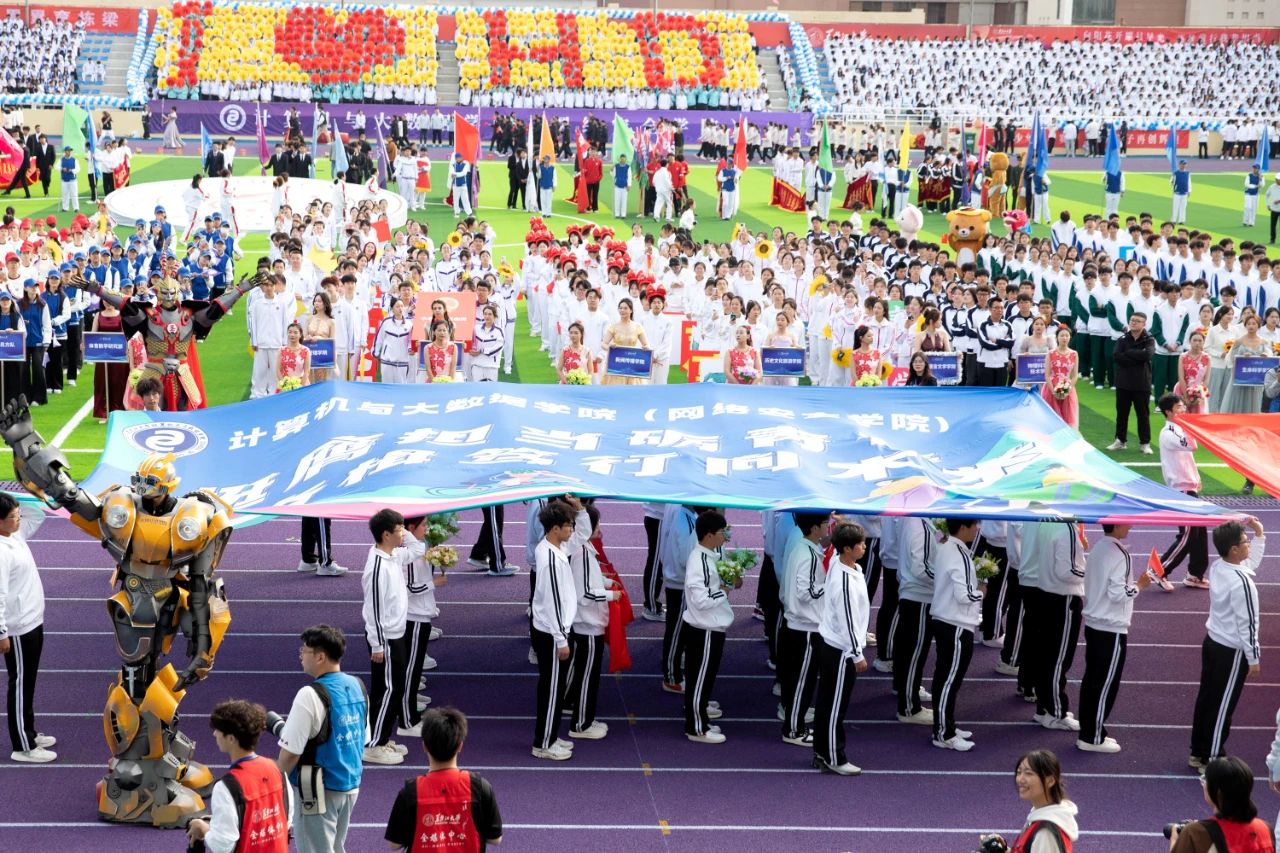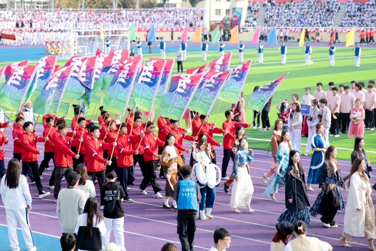经济与工商管理学院舞狮领队欢跃前进,缤纷彩带交织于队列间,和平鸽向蓝天展翅高飞,寄托着对本届运动会的美好祝愿和祖国母亲的诚挚祝福。文学院代表队身着汉服,手持折扇,灵动翩跹,展现了中国传统文化的魅力。伴随着无人机彩烟划过天空,新闻传播学院代表队昂首阔步,手持横幅,口号声激昂豪迈,彰显了青春与活力。计算机与大数据学院(网络安全学院)代表队身姿挺拔,意气风发,充分体现着学院学子们砥砺前行的高昂斗志。尤其值得一提的是,今年,校友代表队首次参加运动会开幕式。
