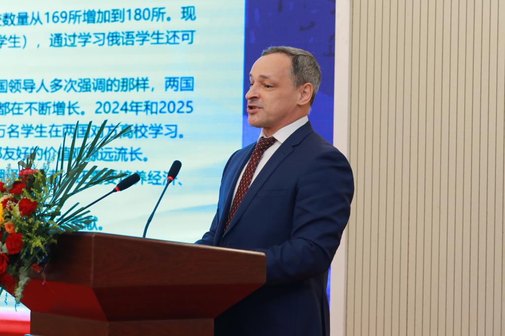 席茹在致辞中表示,今年是“中俄文化年”,两国将在文化与教育领域进一步深化合作。全国俄语大赛作为这一合作的重要组成部分,为学生们提供了展示语言能力、文化认知和跨文化交流的机会。希望参赛选手通过比赛,不仅展示自己的俄语水平,还能深入了解俄罗斯的历史与文化,成为中俄友好交流的使者。