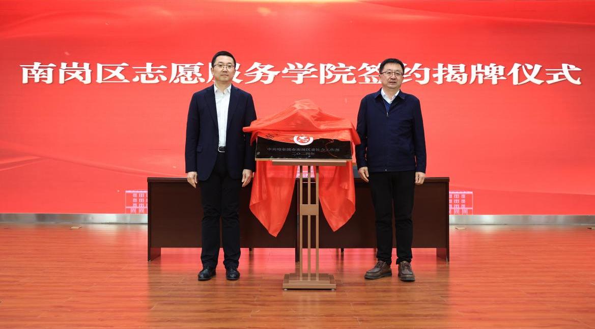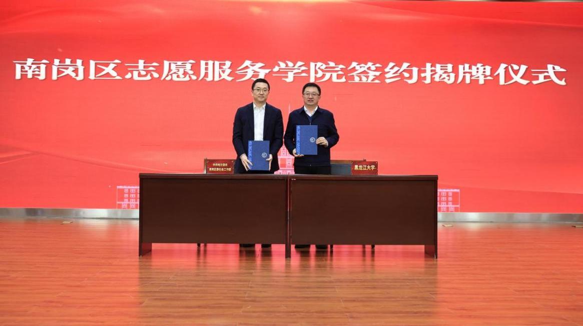 李君明、孟繁东分别代表学校和南岗区委签署战略合作协议,同时为南岗区志愿服务学院揭牌。