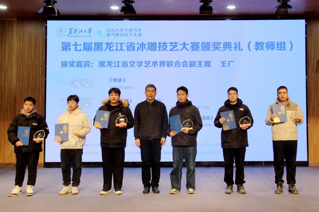 随后,省委宣传部宣教处处长朱东晖为第十届黑龙江省大学生雪雕比赛学生组一、二、三等奖获奖选手颁奖;校党委副书记刘凤影为第二十二届黑龙江省大学生冰雕艺术设计创作大赛学生组一、二、三等奖获奖选手颁奖;省社会科学界联合会二级巡视员李丽萍,省文学艺术界联合会副主席王广,省文化和旅游厅副厅长齐斌,省教育厅总督学刘兆国分别为第七届黑龙江省冰雕技艺大赛学生组一、二、三等奖,教师组一、二、三等奖,优秀指导老师奖,国际邀请组佳作奖的获奖选手颁奖。