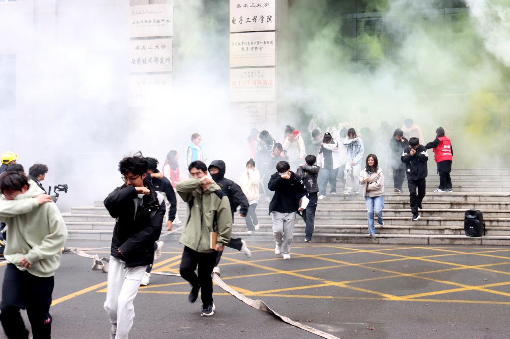 陈维厚宣布演练正式开始。活动首先模拟教学楼火情处置场景。随着消防警报的拉响,实验楼冒出浓烟,同学们弯腰低姿,用毛巾捂住口鼻,沿着指定路线撤离到安全区域。整个过程快速有序,达到预期目标。消防救援展示环节,由消防救援人员操作喷雾水炮消防车向同学们展示高空喷射演示。