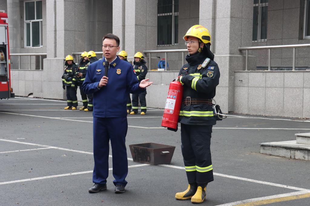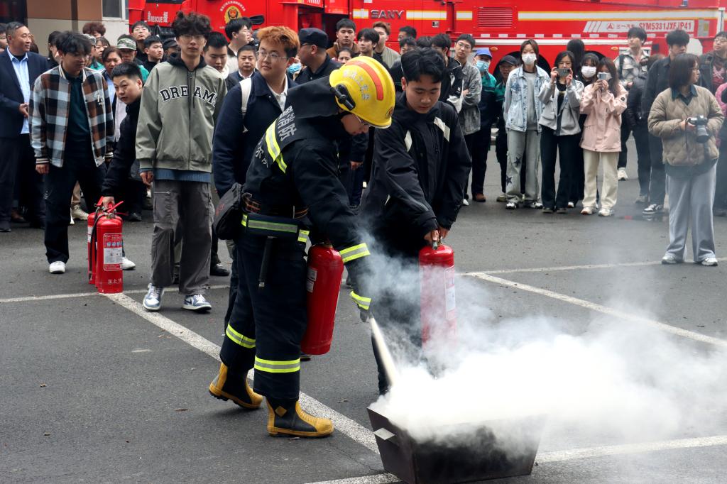 消防逃生疏散演练后,哈西消防中队的教官向师生详细介绍灭火器的作用及使用方法,组织师生进行实操训练,在工作人员的指导下,同学们按照讲解要求,完成“提罐、拔销、压柄、扫射”标准化操作。