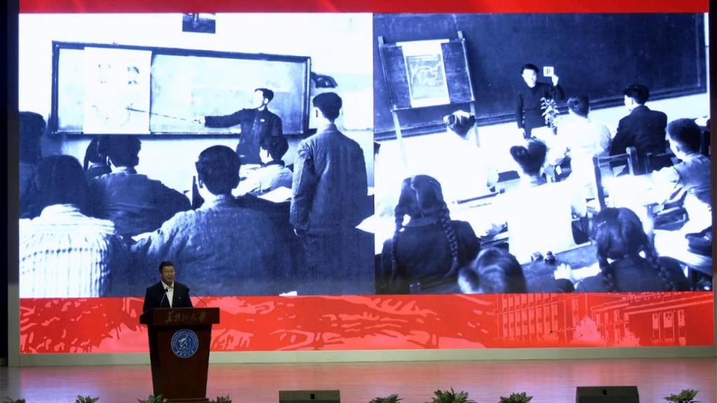红足一1世足球网官方网站党委常委、宣传部部长杨其滨以《从延河畔到松花江边将教书育人进行到底——走近人民教育家王季愚、赵洵》为题,讲述了“人民教育家”王季愚、赵洵深耕教育的一生,展现其以毕生心血铸就黑大教育根基的使命担当。