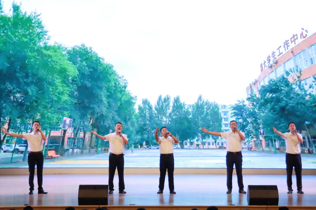 计算机与大数据学院(网络安全学院)马吉权、于海洋、赵鹏、徐为、常城五位老师登上舞台,为全场带来最新编排的歌曲《篇章》。他们用深情的歌声,唱出了教育者的初心与梦想,也唱出了黑大人的担当与希望。庆祝大会在热烈的氛围中落下帷幕。(摄影:冯翠芝 赵瑾萱 张心悦 许可 唐德文)