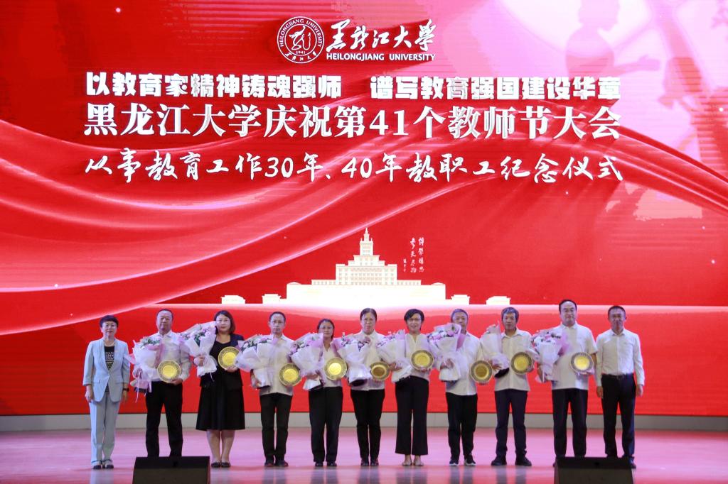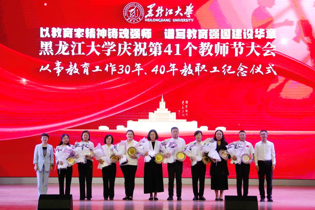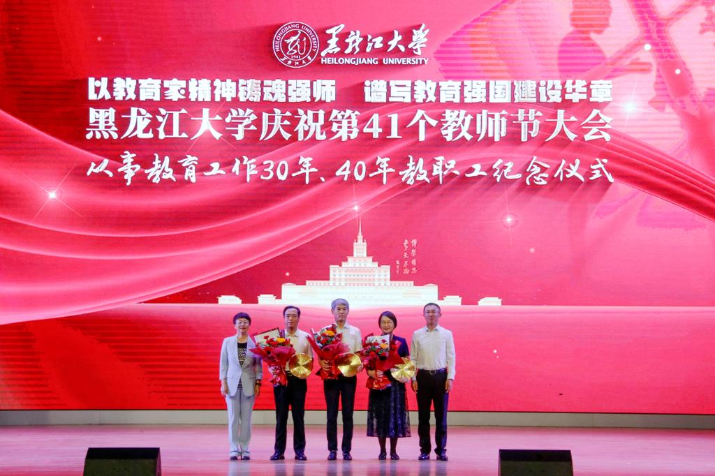 在纪念仪式上,校党委书记迟宝旭、校长王敬波为从事教育工作30年、40年的教职工代表颁发了纪念牌,向他们数十年如一日的坚守、在教育工作岗位上的辛勤劳动,致以崇高的敬意。
