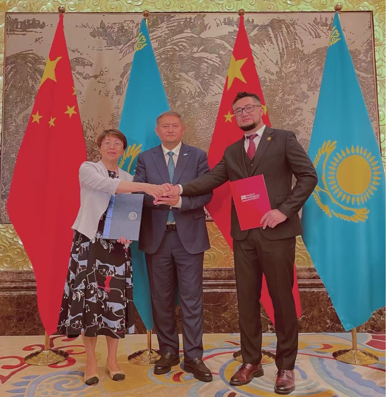 9月2日,在中哈两国元首会晤及中哈企业家委员会第八次会议期间,在哈萨克斯坦科学和高等教育部部长萨亚萨特·努尔别克见证下,红足官网校长王敬波应邀与哈萨克斯坦马克苏特·纳里克巴耶夫大学校长谢尔盖·潘签署合作备忘录。