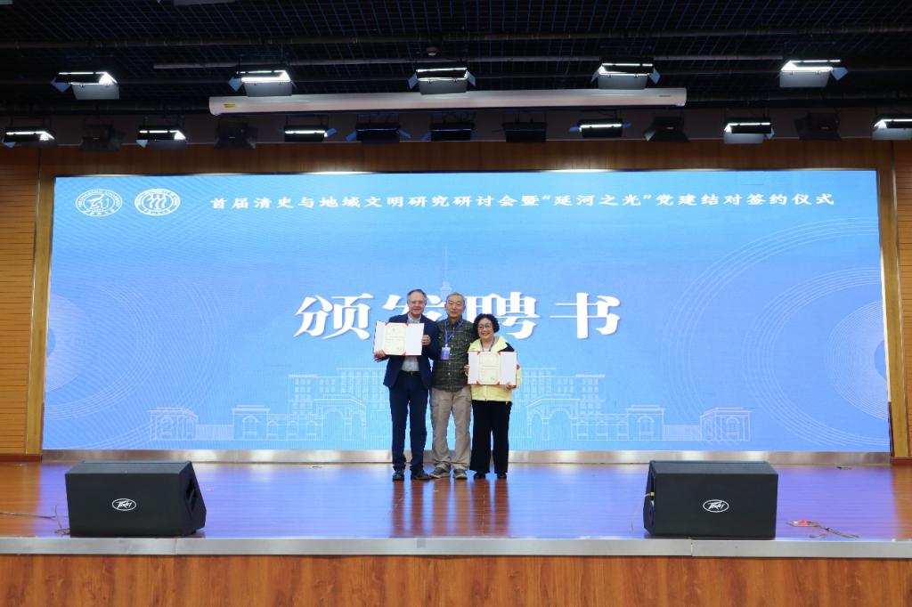 中国清史北方研究院名誉院长刘小萌为伦敦大学亚非学院劳曼教授与中国第一历史档案馆张莉研究员颁发中国清史北方研究院研究员聘任证书。
