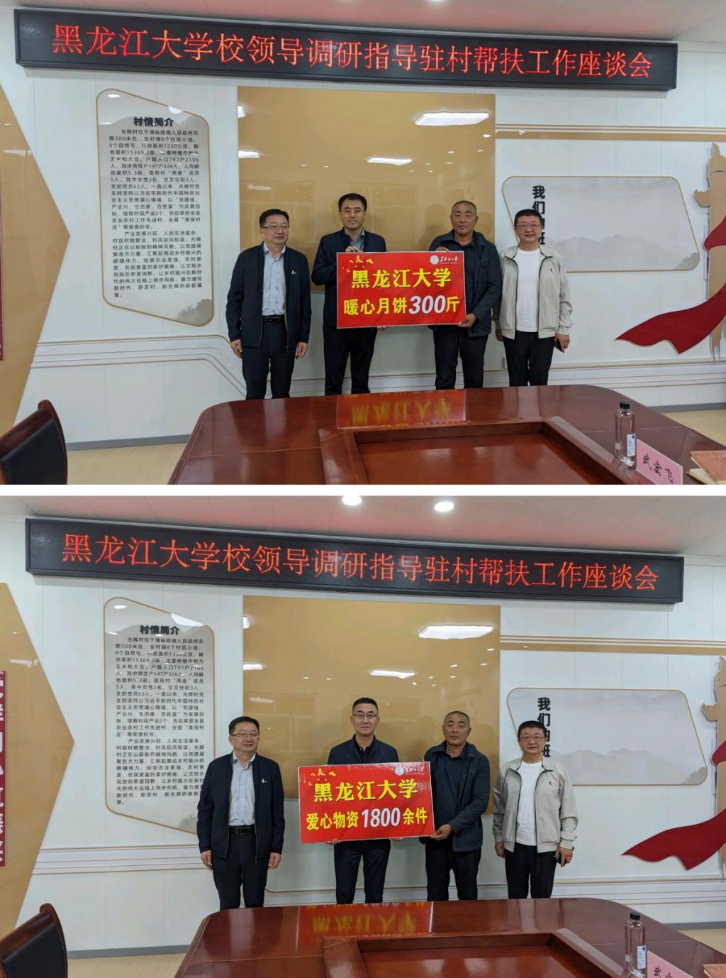 在调研座谈会上,驻村工作队队长、第一书记吴迪围绕建强组织、兴村富民、加强治理、为民服务等工作职责,将3个月来开展的工作及下一步工作思路进行了汇报。校工会副主席李文达将“师情润乡土·爱心聚光辉”活动所募集的1800余件物资、后勤保障处处长翟庚将专门定制的300余斤“暖心月饼”转交给光辉村党支部书记。