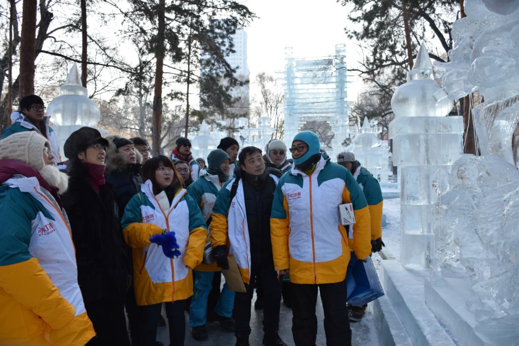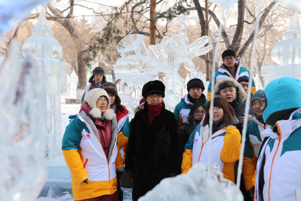 进入兆麟公园的冰雕作品展示园区,就看到了学员们的诸多冰雕作品。这些坐落在园区几个主要景观区域的学员作品丰富多样、结构通透,有创意、有张力,有层次,大胆探索、追求艺术表现和最新的制作技艺。艺术学院副院长余雁向何颖校长介绍了学员们在兆麟公园的教学与实践情况。自11月25日起,暨项目培训开班的第四周进入了培训课程的校外实训阶段,第一个校外实训基地是兆麟公园。截止到12月28日,学员在园区进行了四天的实训课,一共完成了三件大型组雕,十个单体冰雕。这期间部分学员还参加了在兆麟公园举办的省级和全国大学生冰雕大赛,部分学员和带队指导的作品荣获国家级金奖两个,省级银奖两个和铜奖一个,充分体现出本次培训的教学水平。何颖校长一行在园区观赏冰雕作品过程中,对学员的作品特别是获得奖项的艺术表现和雕刻技艺的精湛给予了高度赞赏。