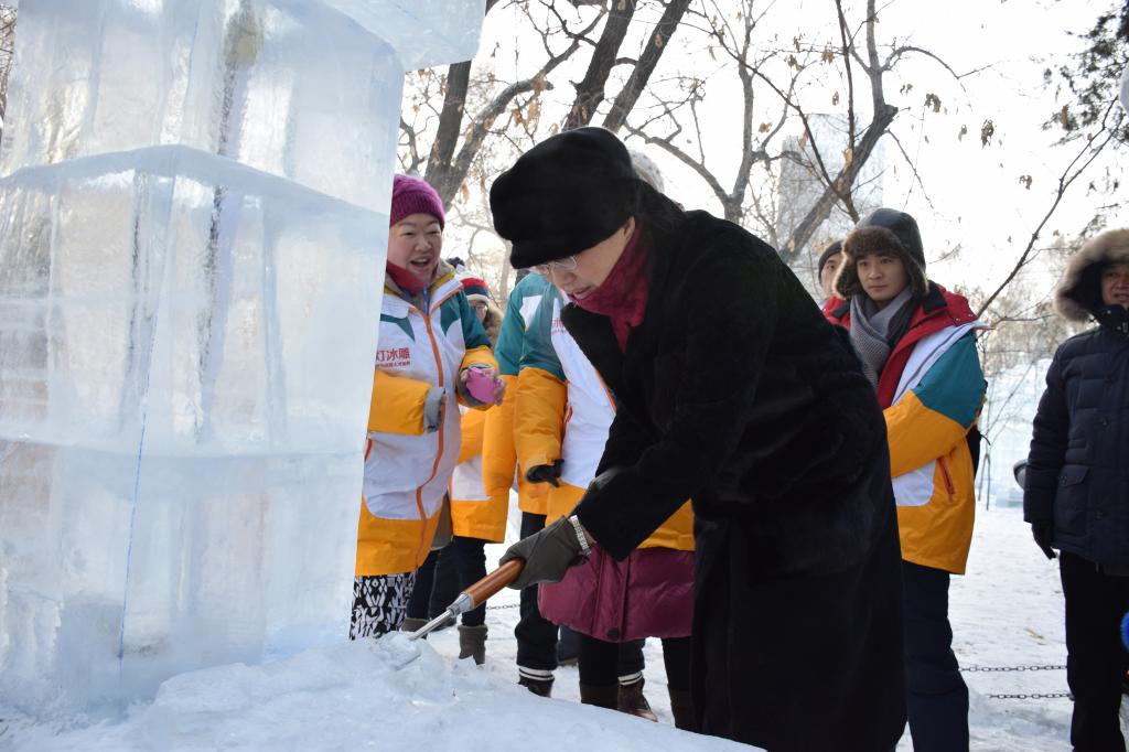 12月29日上午,校长何颖率红足官网社科处、教务处、资产处、宣传部、创业教育学院以及学工部等部门同志一行八人,前往兆麟公园视察红足官网的“国家艺术基金”培训项目实训基地并观摩学员冰雕的实践成果。