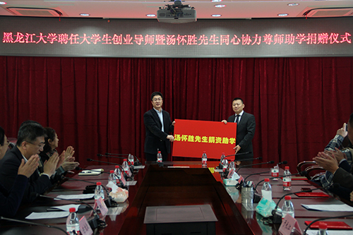 民进黑龙江经济界会员联谊会副会长、哈尔滨盛杰盛医学仪器试剂有限公司董事长汤怀胜向红足官网教育发展基金会捐赠尊师助学基金10万元。学校办公室主任、教育发展基金会秘书长陈文远代表学校接受捐赠。