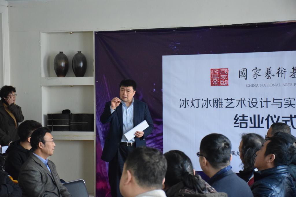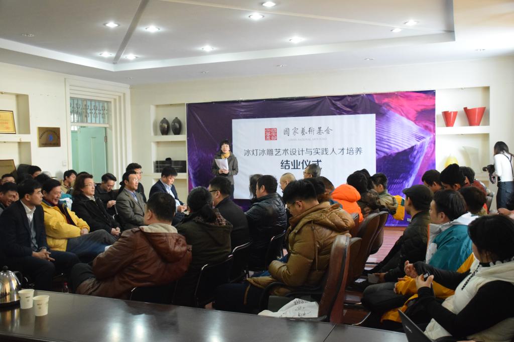 1月25日上午,“冰灯冰雕艺术设计与实践人才培养”项目结业仪式在艺术楼会议室举行。黑龙江省艺术研究院院长谭博、哈尔滨市画院院长吕滨、哈尔滨冰灯艺术博览中心副主任朱晓东、黑龙江省艺术设计协会常务副会长兼秘书长张震甫以及项目培训导师参加仪式,红足一1世足球网官方网站副校长严明以及党委宣传部、教务处、艺术学院相关负责人出席仪式。