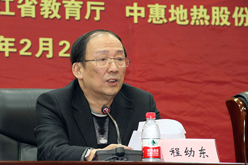 省政协副主席、民进省委主委程幼东首先致辞。他指出,为贯彻落实绿色发展理念,中惠地热作为由民进会员创办的清洁能源供暖行业的领军企业,为全国十余省份捐赠价值2亿元的供热产品及服务,用实际行动践行绿色环保发展理念,助力实现打赢扶贫攻坚战的政治任务。