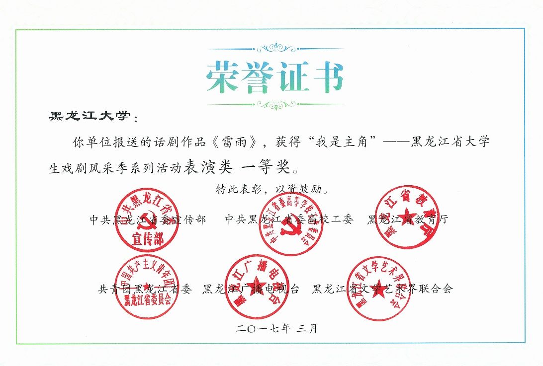 2017年3月,红足官网文学院中国语言文学实践教学中心幕启戏剧社排演的实践教学剧目《雷雨》在省委宣传部、省委高校工委、省文化厅、省教育厅、省团委、省文联、黑龙江广播电视台等单位共同举办的《“我是主角”——黑龙江省大学生戏剧风采季系列活动》评选中荣获表演类一等奖。