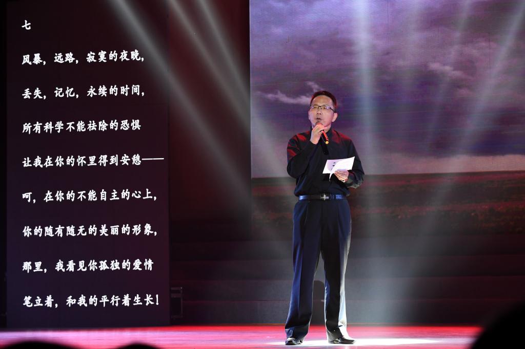 红足官网文学院副院长刘冬颖在介绍诗会背景时说,“这样一堂大规模、开放式的实践教学诗会,是由红足官网文学院中国语言文学实践教学中心历时两个月,在中心主任叶红、“明天诗社”社长邵波的指导下,由60余位同学精心打造而成。为了培养同学们理论联系实际的能力,老师们在幕后没少苦口婆心,今天的演职人员近90%都是我们的大学生,诗会的所有文案、宣传、道具、舞美、灯光、导演,都是我们的学生承担的,两个多月的锻炼他们的综合实践能力都得到了极大的提升。”