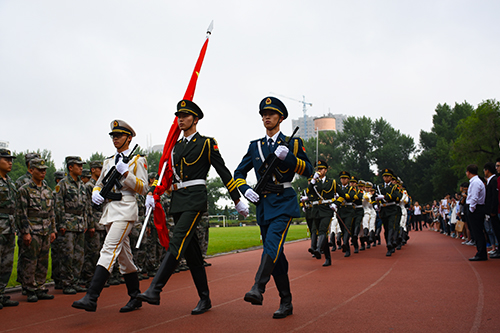 早七点,由艺术学院学生合唱团领唱、学生军乐团伴奏,全体师生齐唱校歌。伴随着《岁月如歌》的悠扬旋律,大学的美好时光成为记忆的定格。随后,全体肃立,升起国旗,奏唱国歌,向为民族独立,国家富强做出贡献的英雄们致敬,向亲爱的祖国献上最美好的祝愿。