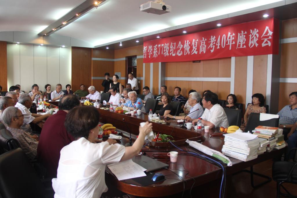 77级哲学系校友们于四十年后相聚母校,大家互相握手、拥抱,共叙同学情谊,共话学校发展,现场温馨动人。