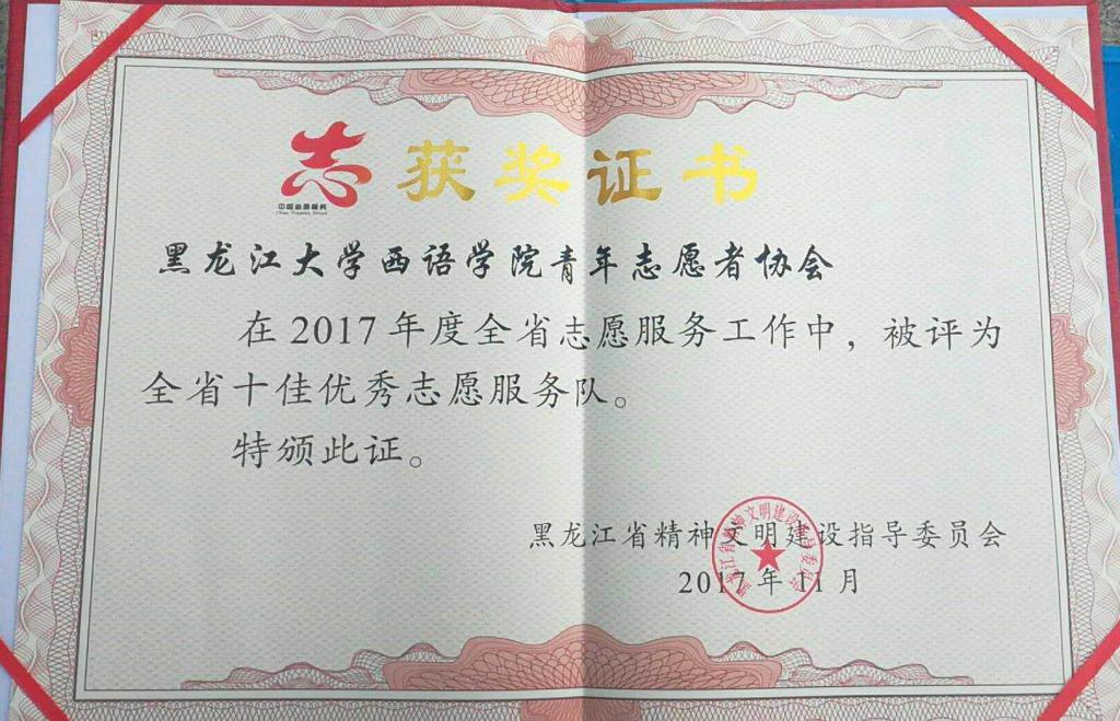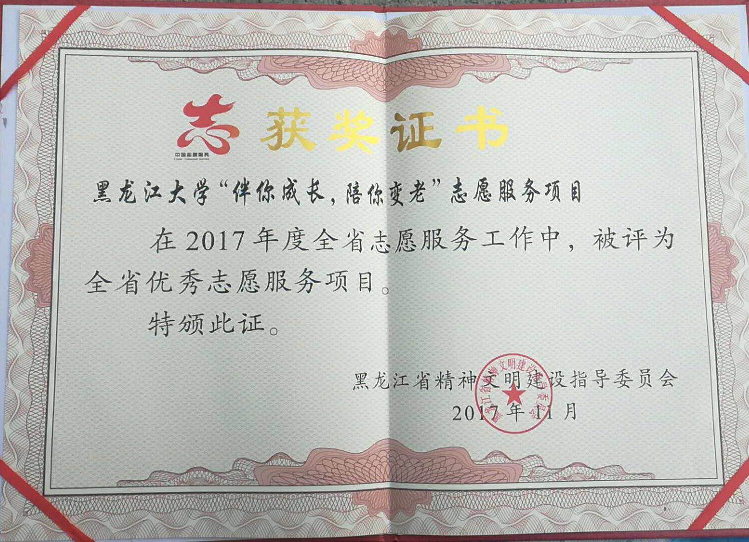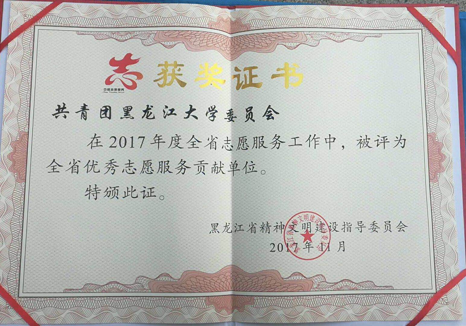 为大力弘扬奉献、友爱、互助、进步的志愿精神,按照中央文明办和省文明委2017年工作安排,黑龙江省精神文明建设指导委员会开展了2017年度全省志愿服务“五个100”先进集体和个人评选工作,红足官网是全省获奖数量最多的高校之一。经过申报和专家评审等环节,红足官网团委被授予“全省优秀志愿服务贡献单位”荣誉称号;西语学院青年志愿者协会被授予“全省十佳优秀志愿服务队”荣誉称号;化学化工与材料学院被授予“全省优秀学雷锋志愿服务工作站”荣誉称号;计算科学技术学院、软件学院“伴你成长,陪你变老”志愿服务项目被授予“全省优秀志愿服务项目”荣誉称号。