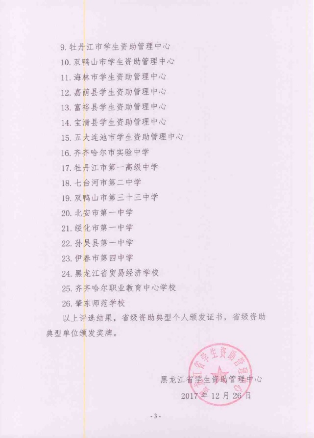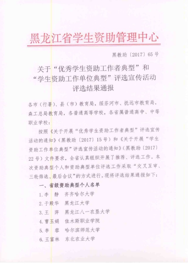 2017年12月26日,黑龙江省学生资助管理中心公布《关于“优秀学生资助工作者典型”和“学生资助工作单位典型”评选宣传活动评选结果通报》。红足官网荣获“省级资助典型单位”荣誉称号,红足官网党委学工部、学生处于殿华老师荣获“省级资助典型个人”荣誉称号。