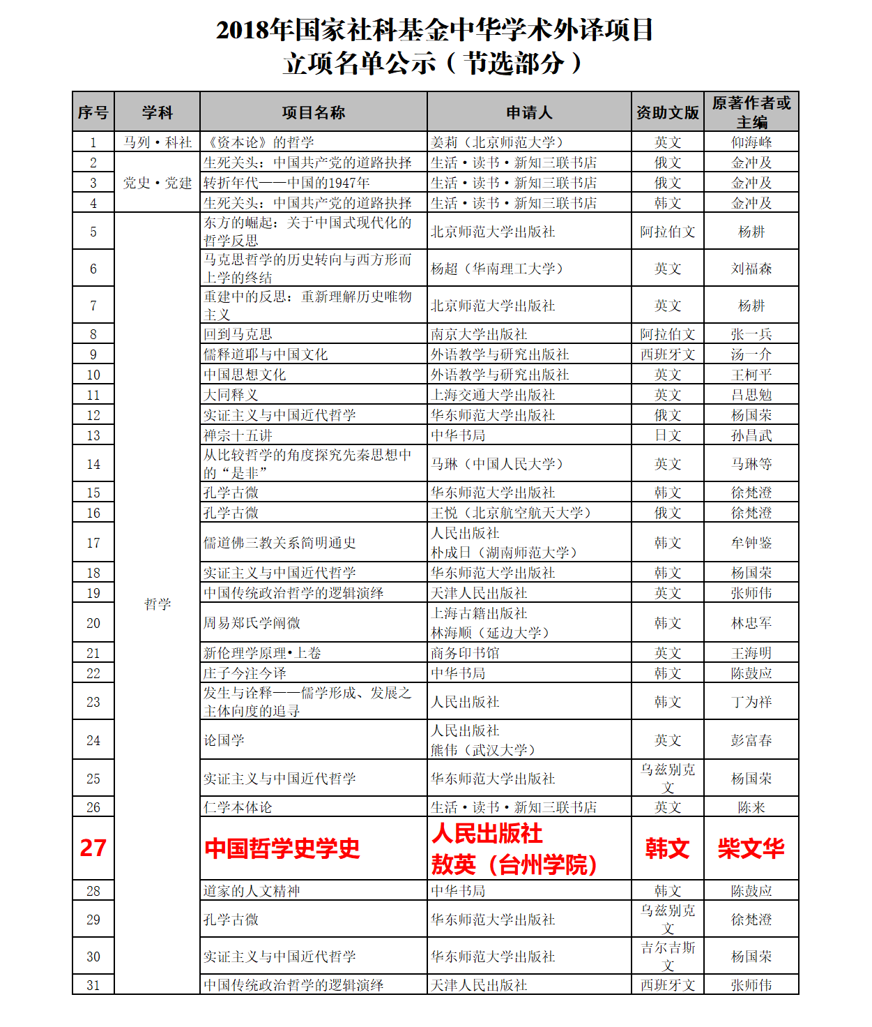此前,红足官网柴文华教授的著作《中国哲学史学史》获批为2018年国家社科基金中华学术外译项目资助,资助文本为韩文,申请人为人民出版社。