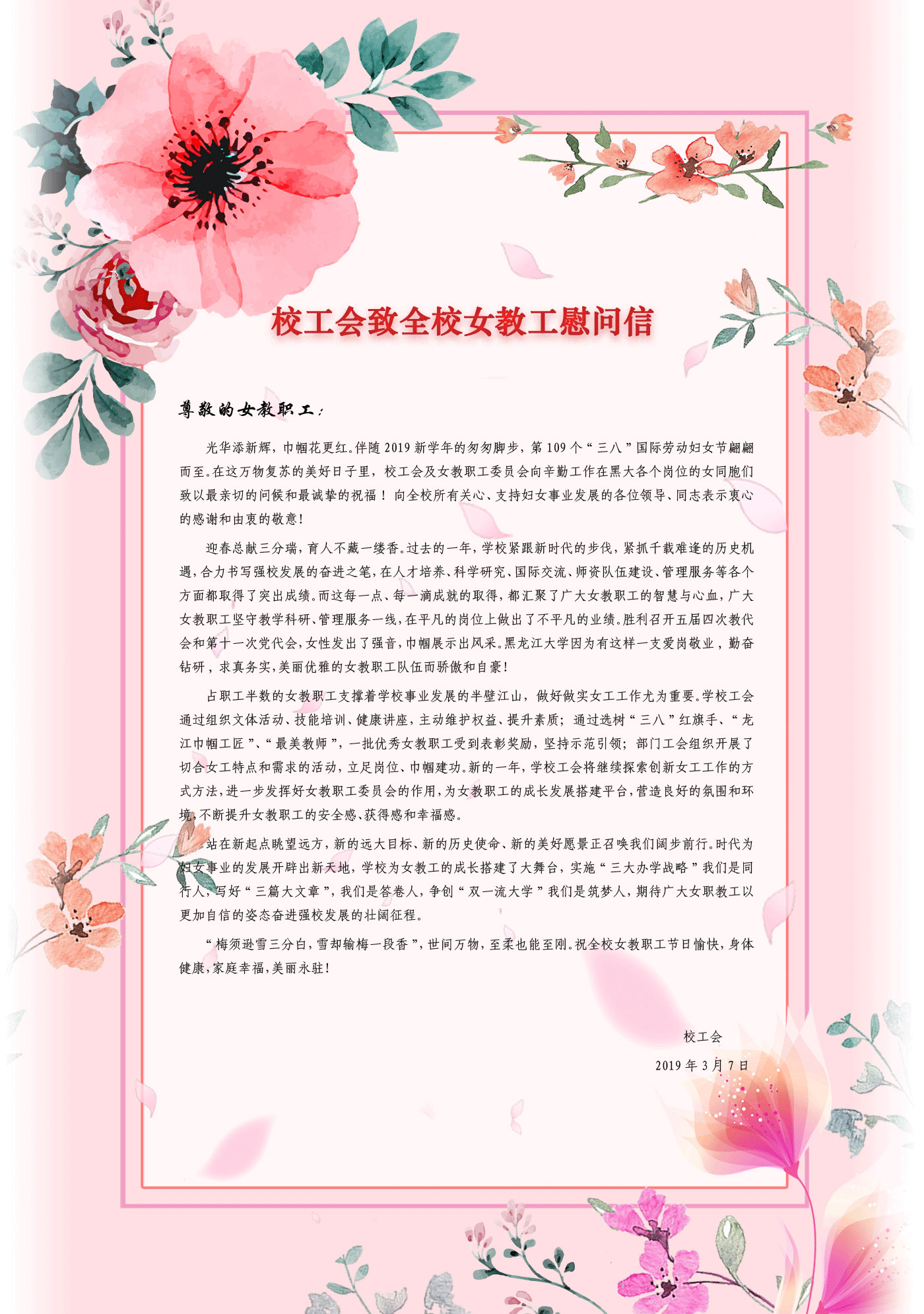 校工会致全校女教工“三八节”慰问信