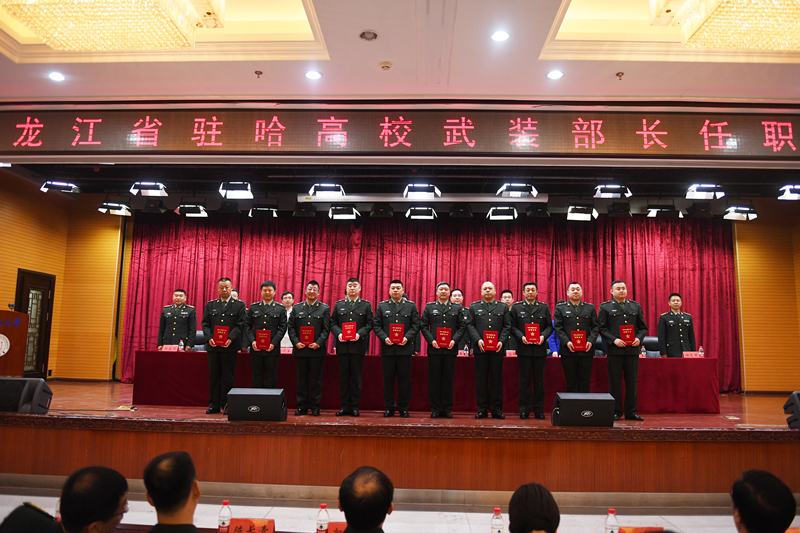 任职仪式在雄壮的国歌声中开始,首先由哈尔滨警备区司令员于兴邦宣读驻哈高校武装部长任职命令,参加此次活动的军地领导为驻哈高校武装部长任职代表颁发任职证书。