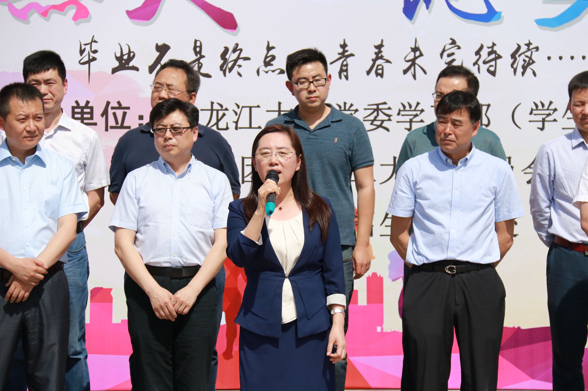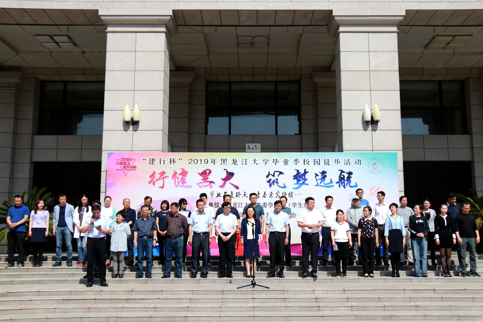 丁宏副书记在活动现场致辞,她代表学校党委对参加本次活动的领导、老师和毕业生们表示热烈欢迎,对中国建设银行哈尔滨香坊支行对活动的大力支持表示衷心感谢。丁宏副书记在致辞中表示,时光如水,岁月如歌,大家的大学生活也即将画上圆满的句号,学校各部门、各学院都在竭尽全力推进毕业生离校工作,为大家的顺利毕业保驾护航。她希望通过此次校园徒步活动,让大家重走一次校园路,重新感受校园里的一草一木,重新回忆大学四年里的一点一滴。四年黑大人,一生黑大情,她希望大家毕业后依旧关心母校、心系母校,母校将永远是大家的精神家园!更希望全体毕业生铭记自己的梦想和责任,牢记党和祖国的嘱托,在今后的工作生活中,秉承“志存高远、爱国奉献、艰苦奋斗、自强不息”的黑大精神,树立远大理想,热爱伟大祖国,担当时代责任,勇于砥砺奋斗,练就过硬本领,锤炼品德修为,脚踏实地走好人生每一步,走向人生美好的未来!最后,丁宏副书记宣布“行健黑大 筑梦远航”2019年毕业季校园徒步活动正式开始。