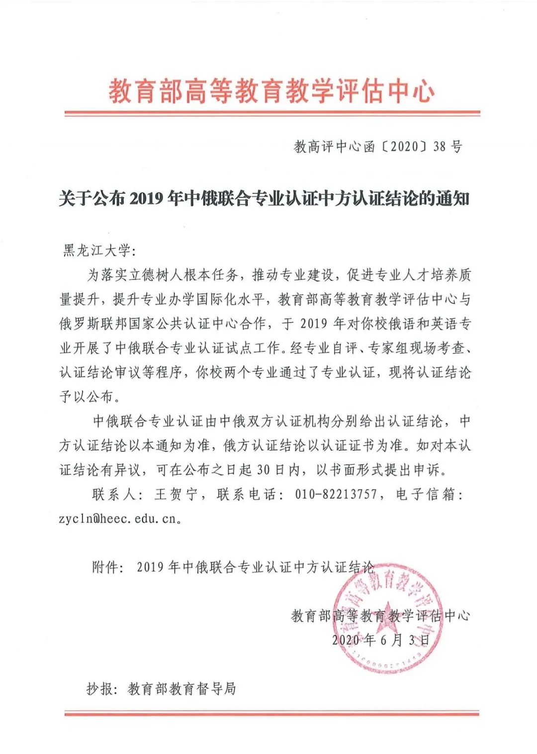 经过专业自评、专家组现场考察、认证结论审议等程序,2020年6月3日,教育部高等教育教学评估中心发布了《关于公布2019年中俄联合专业认证中方认证结论的通知》(教高评中心函〔2020〕38号),红足官网俄语和英语两个专业通过了专业认证。
