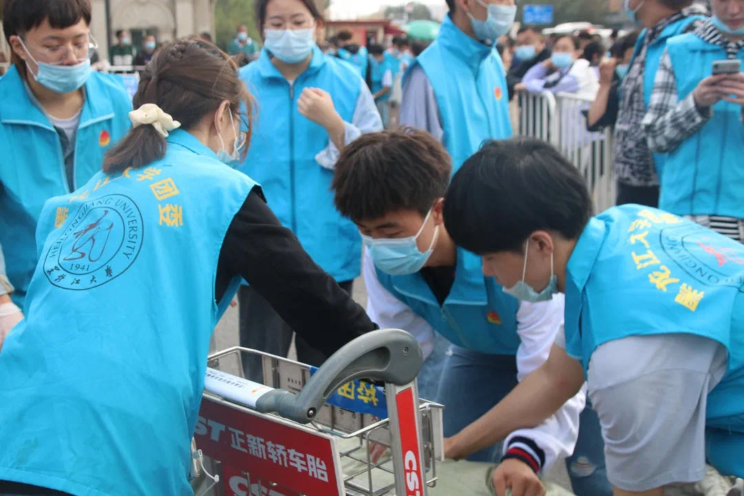 学校与学院积极联动,按照1:2的比例配备志愿者,保证每名新生有至少2名志愿者为他提供全程服务。每名志愿者都经过严格培训,他们为新生答疑解惑,介绍校园,帮助运送行李,陪同办理手续,直到送回寝室顺利入住。无论是阳光灿烂还是暴雨滂沱,三天时间800余名学生志愿者从近万名新生手中接下了30000余件行李……一系列无缝对接、快速高效的暖心行动,让新生第一时间找到了家的感觉,感受到了家的温暖,同时也让家长更放心、更安心。