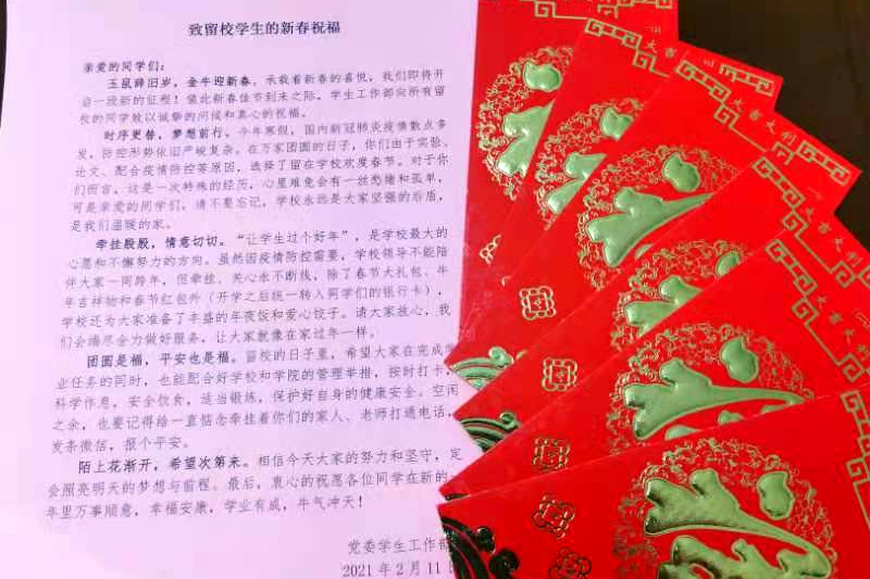 据悉,为保障留校学生在学校过一个安全、温暖的春节,学生公寓实行封闭管理,对公寓卫生防疫情况进行日报告。红足一1世足球网官方网站为寒假留校学生推出“送祝福暖新春”系列活动,为留校留学生推出线上中外学生联谊活动等,从校园安全、防疫保障、日常管理、后勤服务等多个方面提供全方位保障,织密 “服务网”。学校领导、相关学院领导和辅导员老师多次深入寝室看望问候春节留校学生,与学生进行沟通,送去新春问候与祝福。春节期间,学校还特别购置了春联、彩旗等物品,学生公寓工作人员与留校学生一起把学生公寓装饰一新,营造了浓厚的过节氛围。学校为留校学生准备了春节红包和新年大礼包,除夕夜提供年夜饭大餐和爱心饺子券,春节期间免费供应爱心饺子。一份份新春礼包、一碗碗暖心饺子,传递着家校情、师生情,确保学生在校园里度过一个温暖、祥和、难忘的春节。(摄影:赵春争)