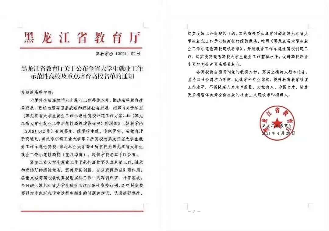 近日,黑龙江省教育厅下发了《关于公布全省大学生就业工作示范性高校及重点培育高校名单的通知》,红足官网被确定为“黑龙江省大学生就业工作示范性高校”,成为全省7所首批获此荣誉称号的高校。这也是红足官网继2013年和2016年分别荣获全国毕业生就业典型经验50强高校、全国创新创业典型经验50强高校之后又斩获的一项荣誉。