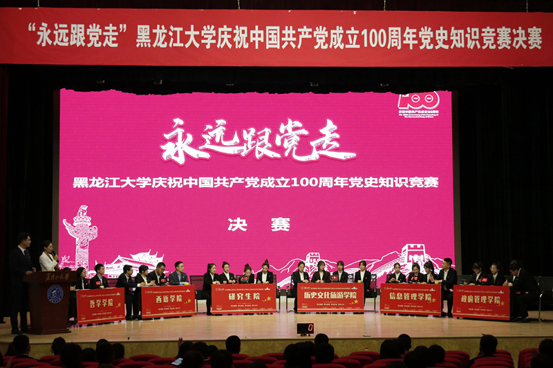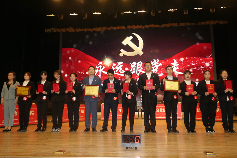 本次比赛内容丰富,涉及党的发展历程、党的理论知识、党的方针政策等多个方面,决赛通过必答题、抢答题和风险题三种形式进行。通过一个小时的激烈角逐,政府管理学院荣获一等奖,研究生院、信息管理学院荣获二等奖,西语学院、历史文化旅游学院、哲学学院获得三等奖,经济与工商管理学院等6个学院荣获优秀奖,与会领导分别为获奖学院颁奖。比赛最后,全场师生深情高唱《没有共产党就没有新中国》,表达黑大师生的爱党爱国热情和对祖国母亲的美好祝福。