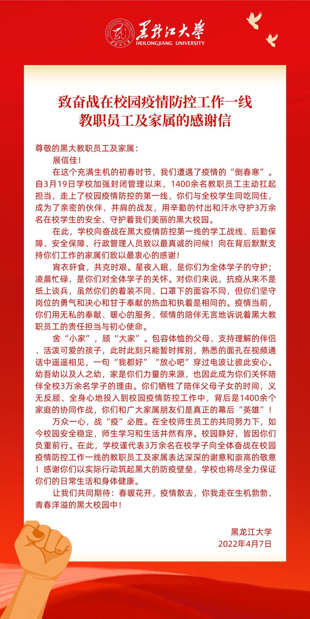 致奋战在校园疫情防控工作一线教职员工及家属的感谢信