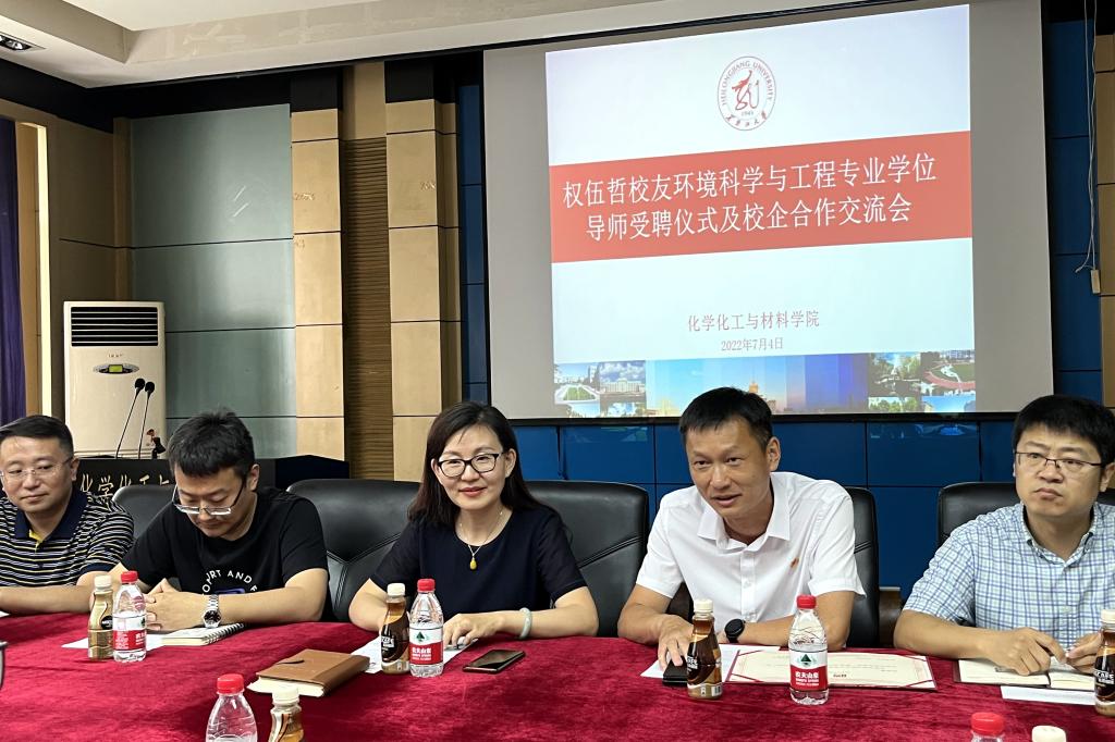 当天下午,权伍哲校友参加了化学化工与材料学院举行的硕士生导师仪式及校企合作交流会。学院党委书记秦川丽、院长许辉及相关专业和学科的负责同志出席会议。会上,许辉院长从专业建设、学科发展、科学研究、师资队伍、人才培养等方面,重点就近几年学院在“双万专业”建设、国家级和省部级人才队伍建设、硕博学位点建设、科学研究特色等方面取得的跨越式发展进行了介绍。环境科学与工程学科负责人邹金龙介绍了学科相关研究方向和在环境与能源催化技术、环境分析与检测技术、环境污染治理技术等方面的科研成果、学生培养成效以及学科对地方经济的服务和支撑。环境科学专业负责人朱琦介绍了本专业的整体情况,特别是在环境检测、环境规划、环境保护等方面的学生培养突出成果。