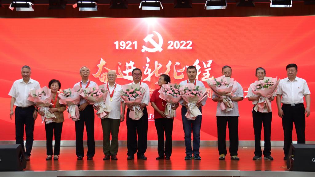 校党委书记王永清、校长付宏刚为15名“光荣在党50年”的党员颁授了纪念章。一枚枚沉甸甸的纪念章,纪念着一段段不平凡的岁月,代表的是对老共产党员的礼赞和褒奖,他们践行初心使命,始终勤勤恳恳为党工作、为校服务,谱写了一曲曲奋斗赞歌。