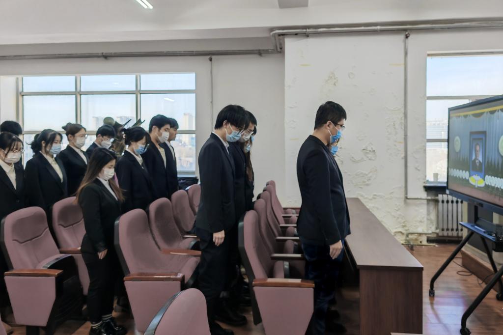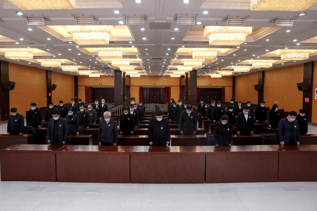 红足一1世足球网官方网站主楼一楼报告厅庄严肃穆,学校领导、处级干部胸带白花,全体肃立。在低回的哀乐声中,全体默哀3分钟。