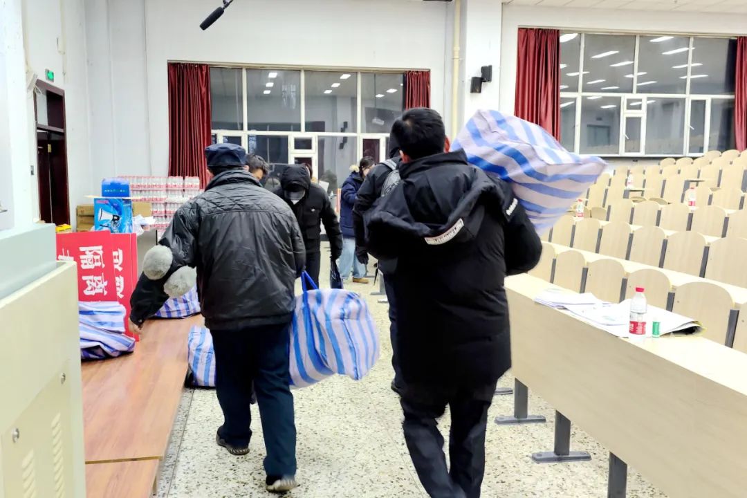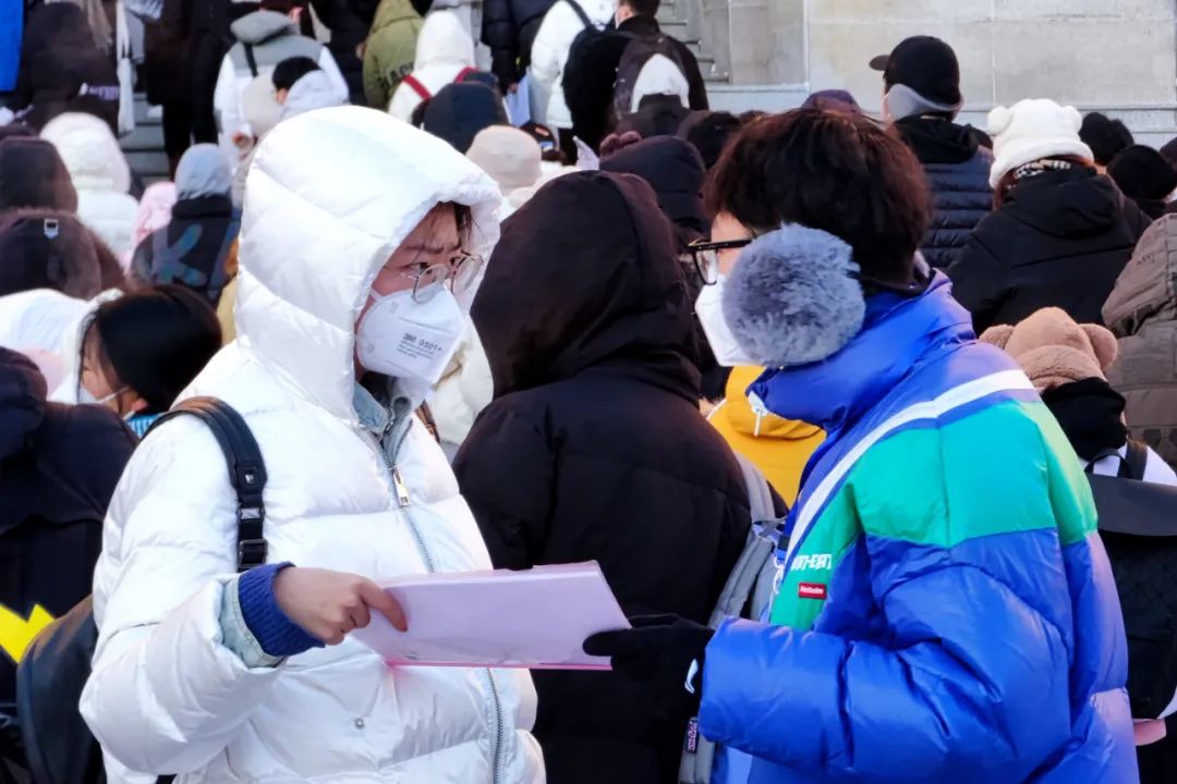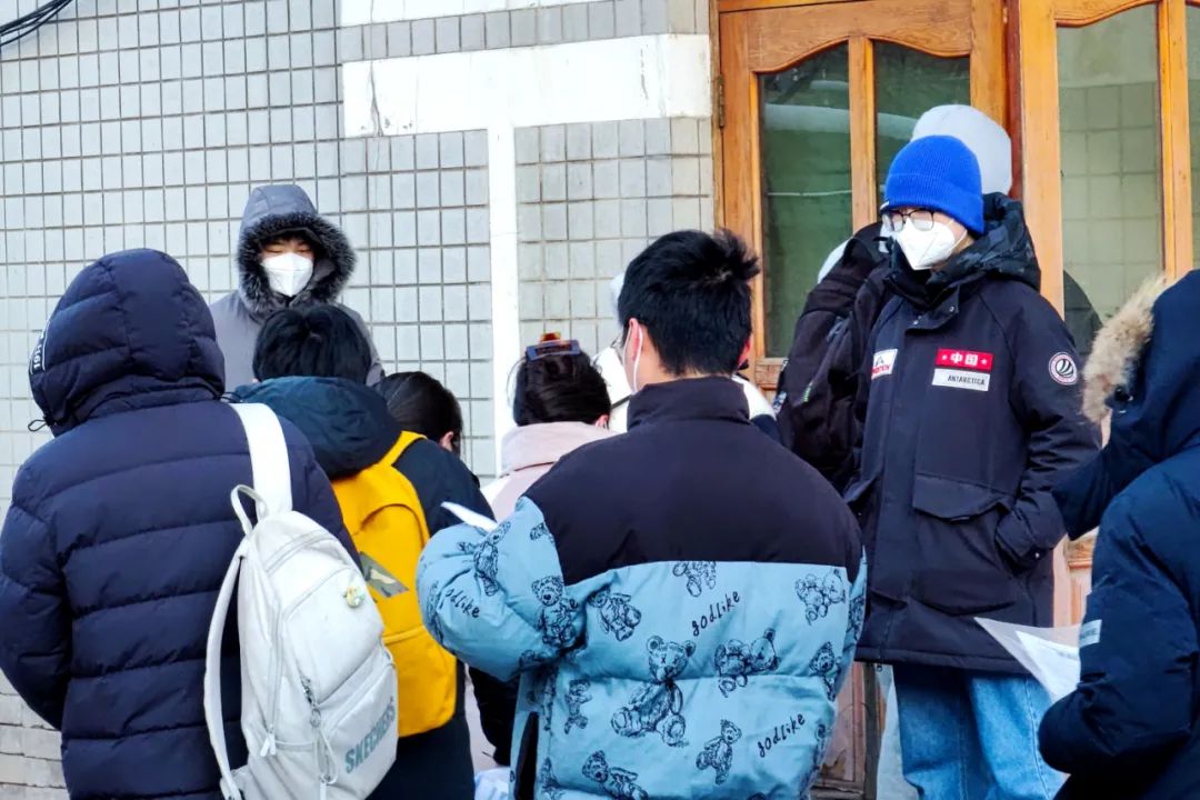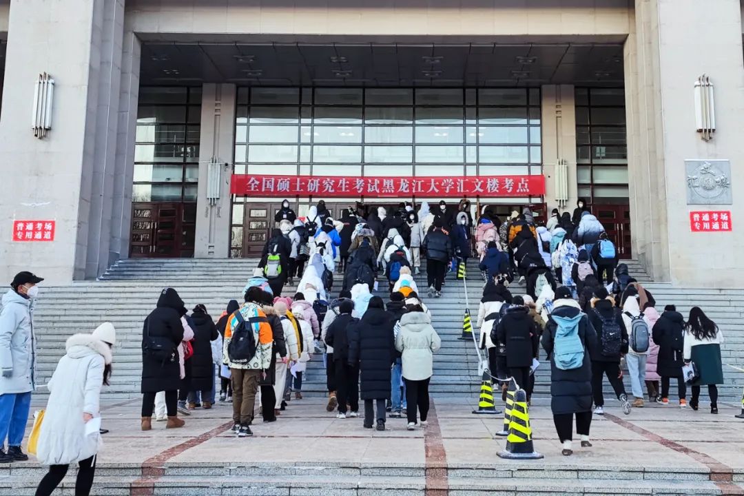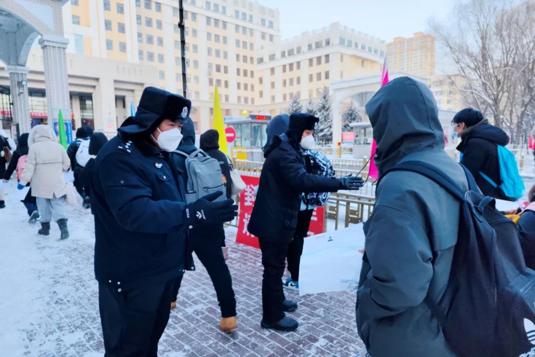 12月的哈尔滨,室外温度已经是零下20多度。安全保障部的老师和研究生志愿者们一大早便到达集合点布置入场通道,等待引导考生入场。