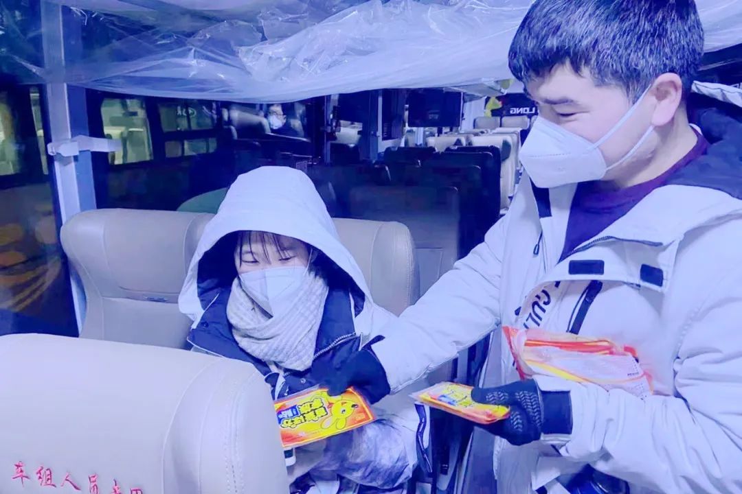 考试当天,工作人员现场指挥、协调、调度10辆爱心送考车,引导考生有序上车,为考生分发暖贴,做好暖心送考服务。