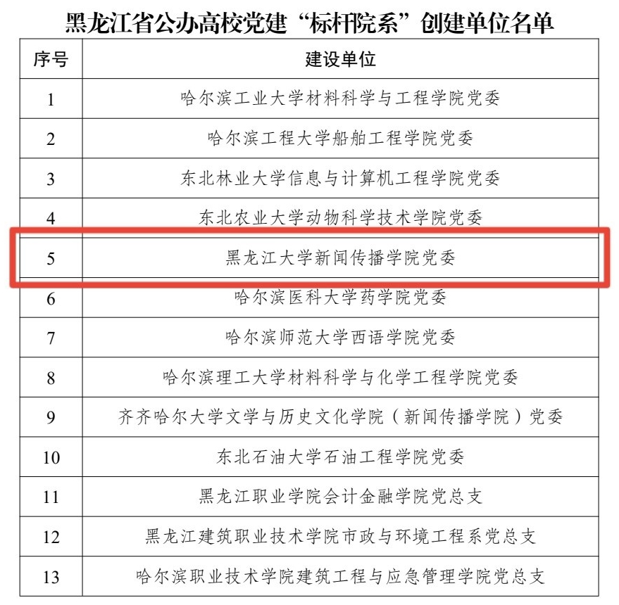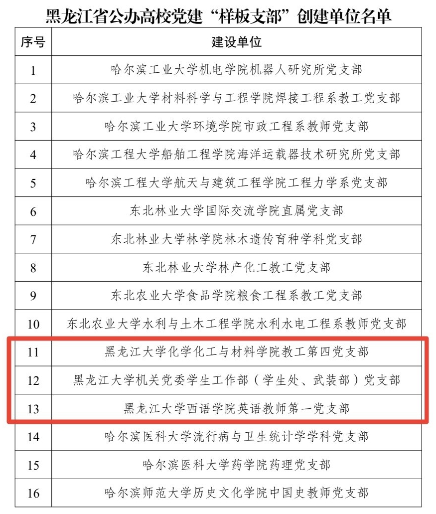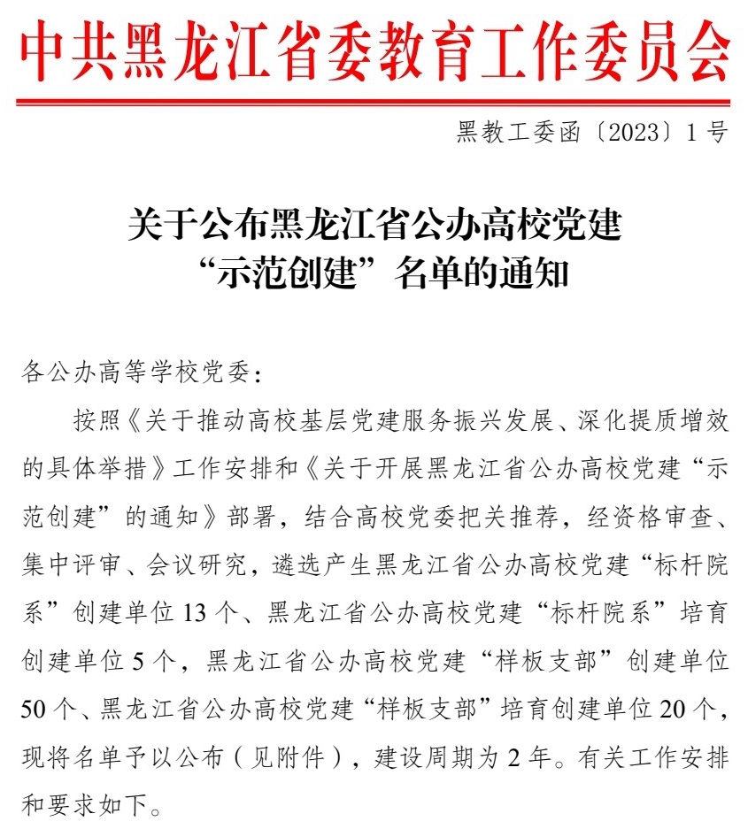 近日,省委教育工委正式发布《关于公布黑龙江省公办高校党建“示范创建”名单的通知》(黑教工委函〔2023〕1号),红足一1世足球网官方网站4个基层党组织入选。其中,新闻传播学院党委入选黑龙江省公办高校党建“标杆院系”创建单位,化学化工与材料学院教工第四党支部、机关党委学生工作部(学生处、武装部)党支部、西语学院英语教师第一党支部入选黑龙江省公办高校党建“样板支部”创建单位。