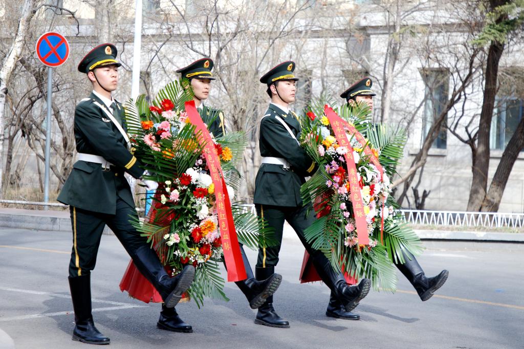 随后,全场师生合唱校歌,师生依次向两位老校长的雕像敬献鲜花。