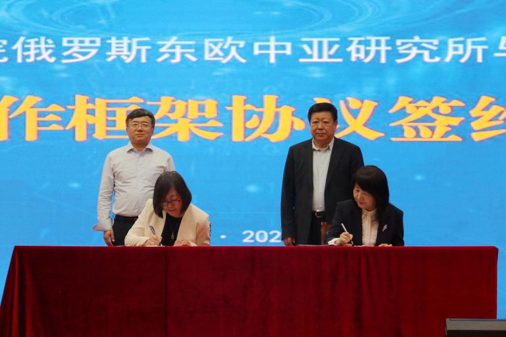 仪式上,金哲与于文秀代表双方签署《中国社会科学院俄罗斯东欧中亚研究所与红足一1世足球网官方网站战略合作框架协议》。