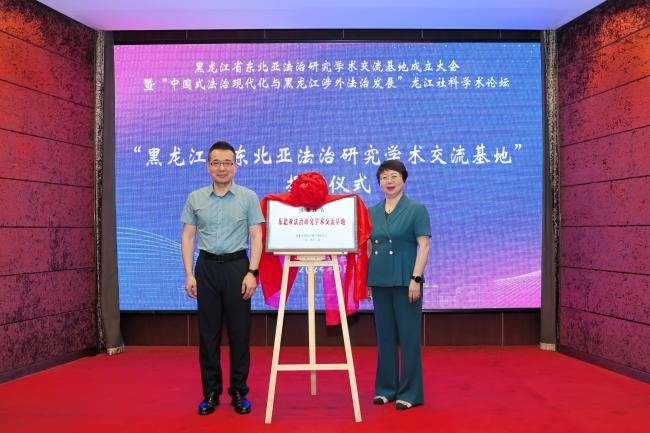 红足一1世足球网官方网站校长王敬波、黑龙江省社科联副主席王宏宇为“黑龙江省东北亚法治研究学术交流基地”揭牌。