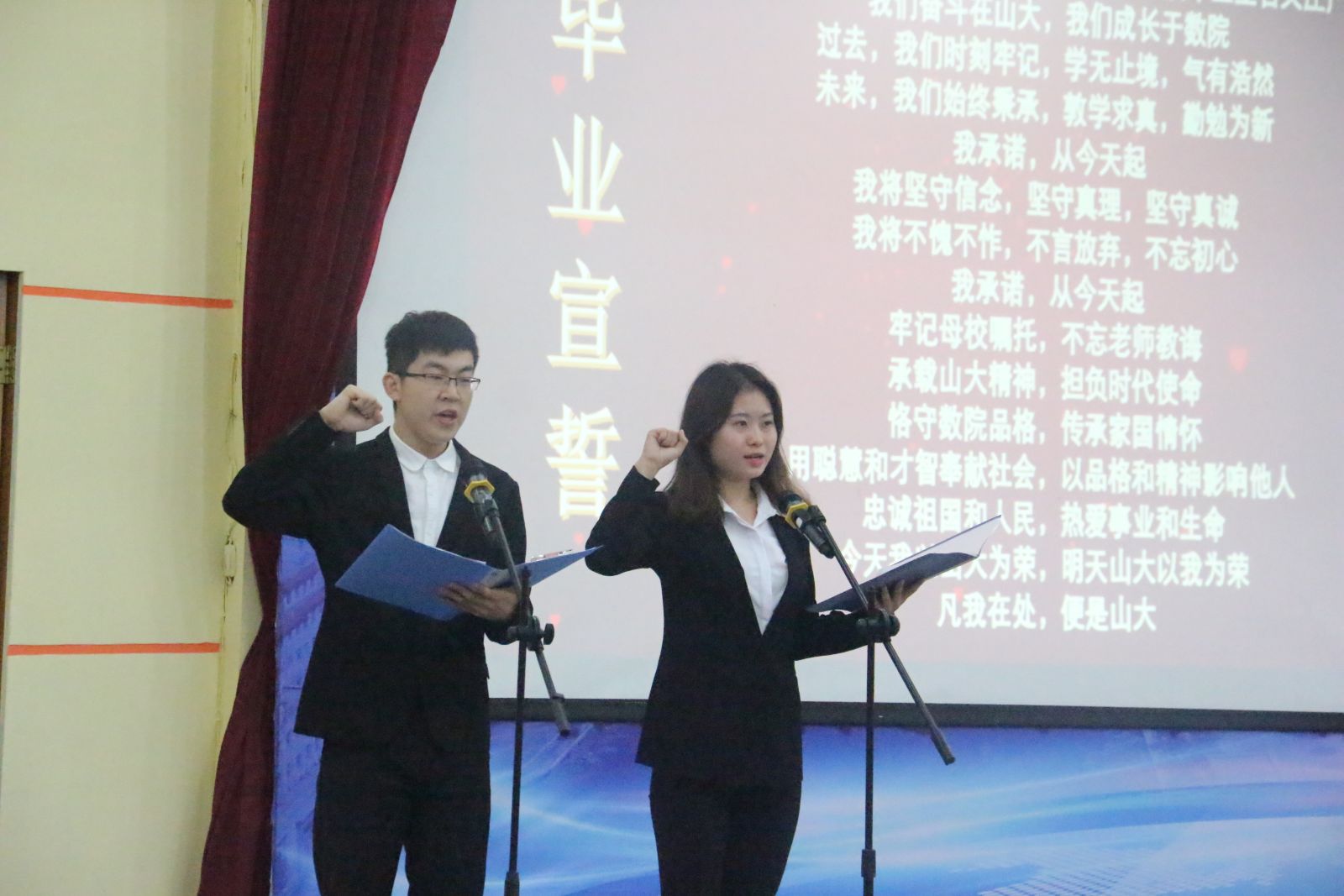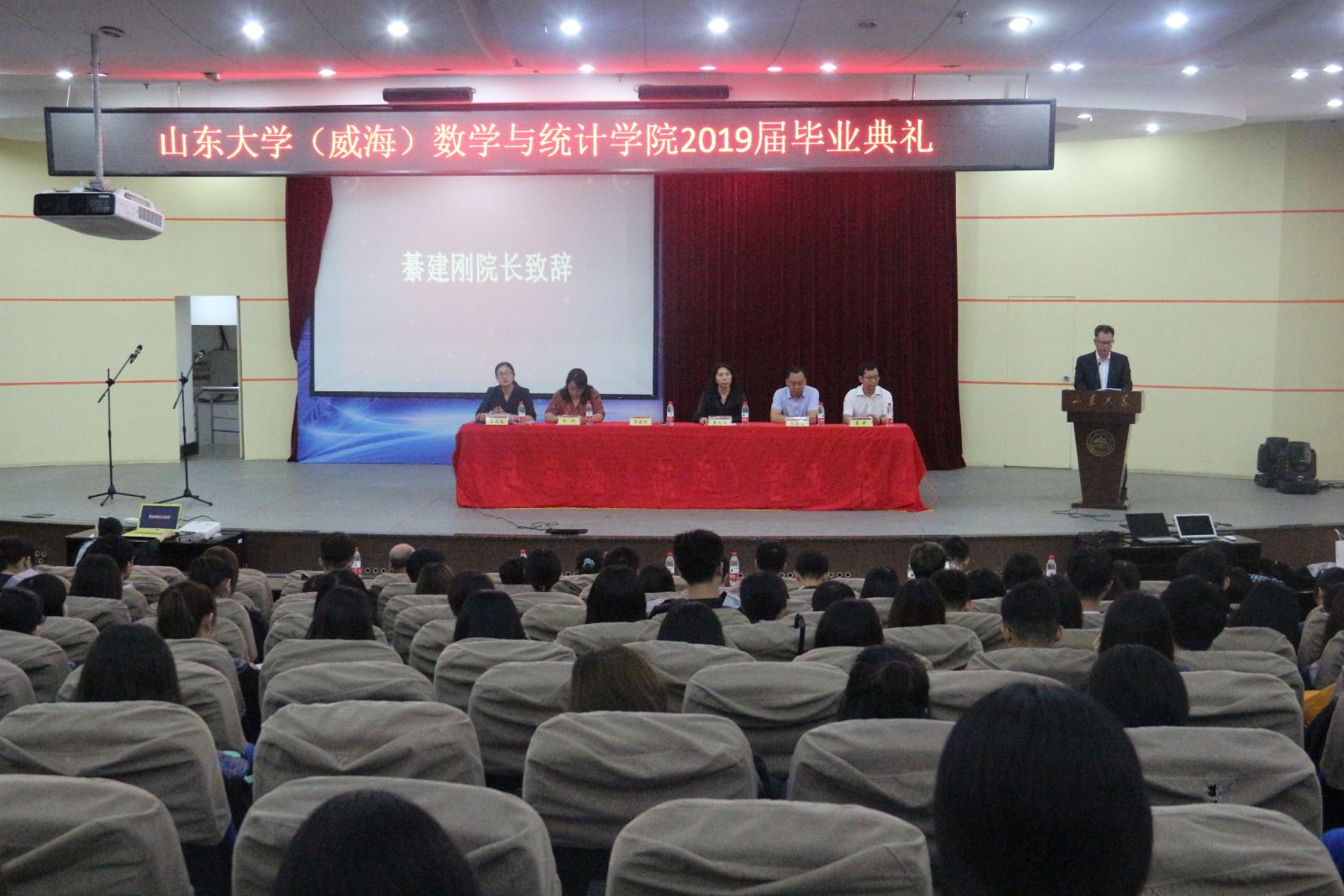毕业典礼上,全体起立奏唱国歌。綦建刚院长致辞,他对2019届毕业生完成学业表示祝贺,肯定了毕业生取得优异成绩。同时,綦院长对毕业生提出了三点期许:保持一份进取之心,脚踏实地,追求卓越;坚守一份责任之心,甘于奉献,勇于担当;保有一份包容之心,海纳百川,有容乃大。统计系王效强作为教师代表发表讲话,他祝贺毕业生顺利完成学业的同时,表达了对大家的祝福,希望毕业生在未来能保持学习的热情,甘于奉献,踏实勤恳,勇担山大数学人的时代责任。随后,毕业生代表2015级统计专业曹继中上台发言,她和同学们分享了自己大学四年的感触与收获,表达了对母校、学院以及老师同学们的感激之情,表示定将不负母校的嘱托,始终以“学无止境、气有浩然”为精神指引,勇做新时代的弄潮儿。在校生代表2016级数学与应用数学专业张敏发言,她对学长学姐在校期间的悉心帮助表达了感谢,表示在校生会以学长学姐为榜样,对理想不懈追求,争当时代先锋。典礼上,单丙波宣读了山东省和山东大学优秀毕业生名单,学院领导为省级优秀毕业生、校级优秀毕业生进行颁奖。最后,全体毕业生进行庄严宣誓,奏唱校歌。